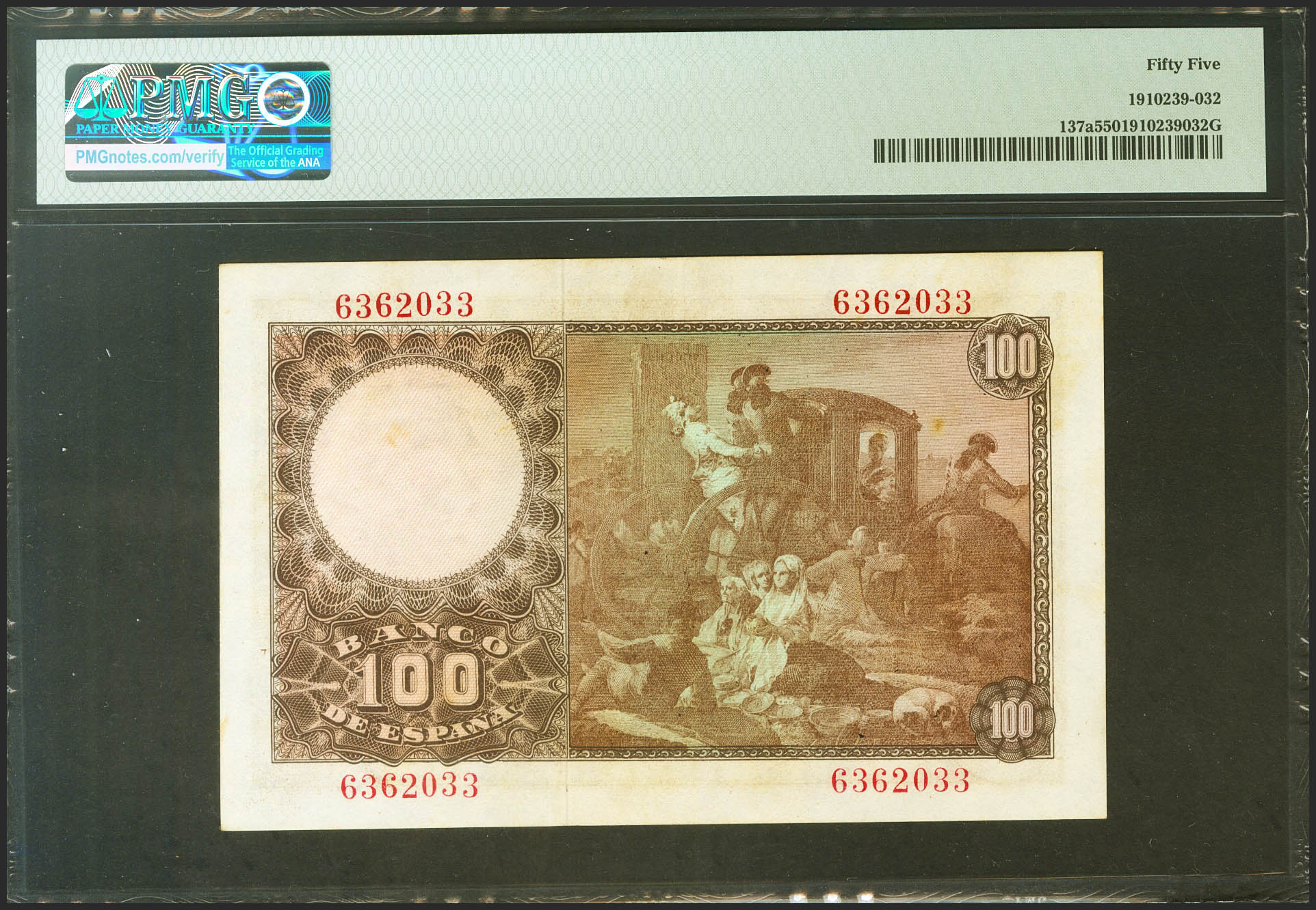 100 Pesetas. 2 de Mayo de 1948. Sin serie. (Edifil 2021: 456, Pick: 137a). Inusual. EBC+. Encapsulado PMG55.