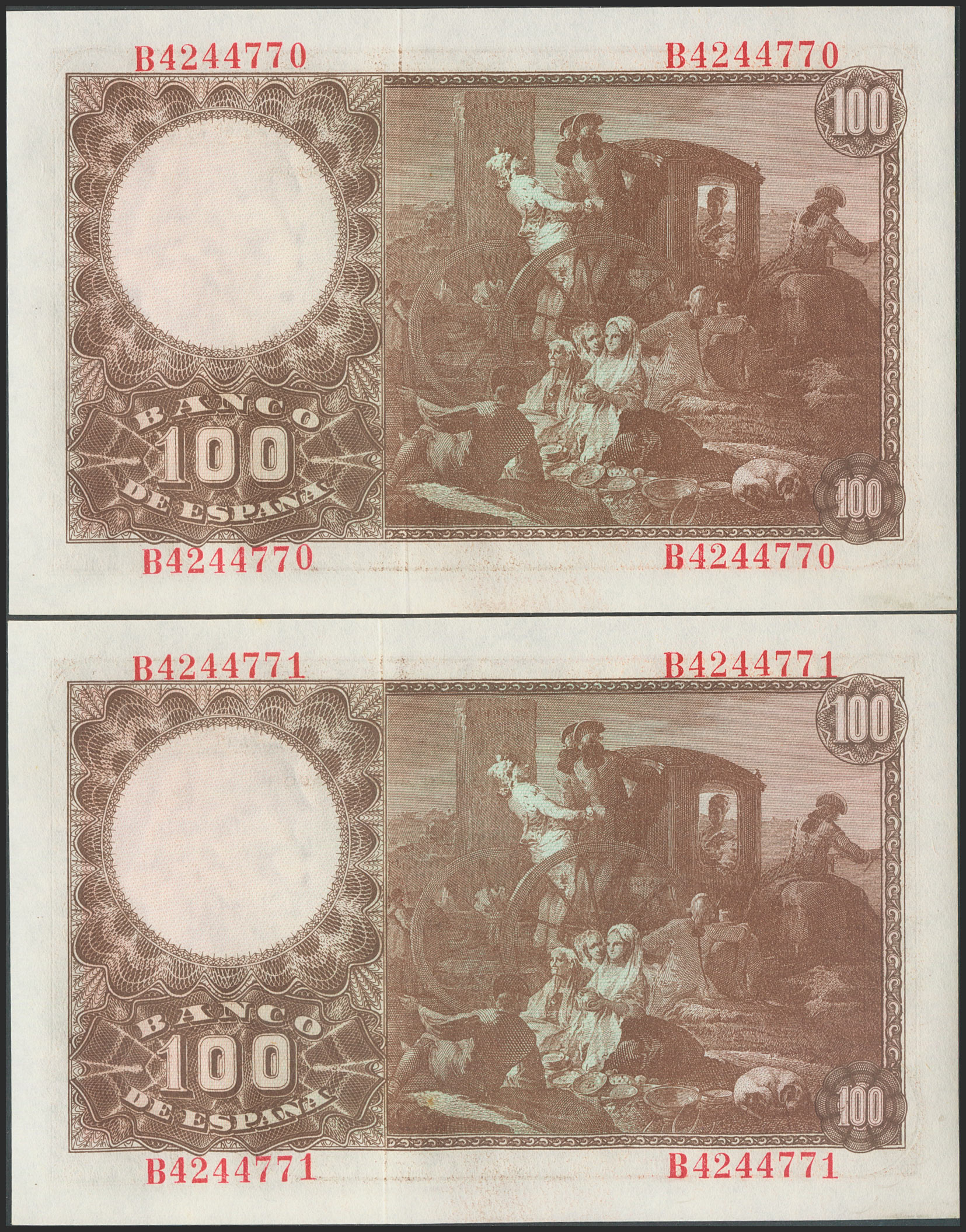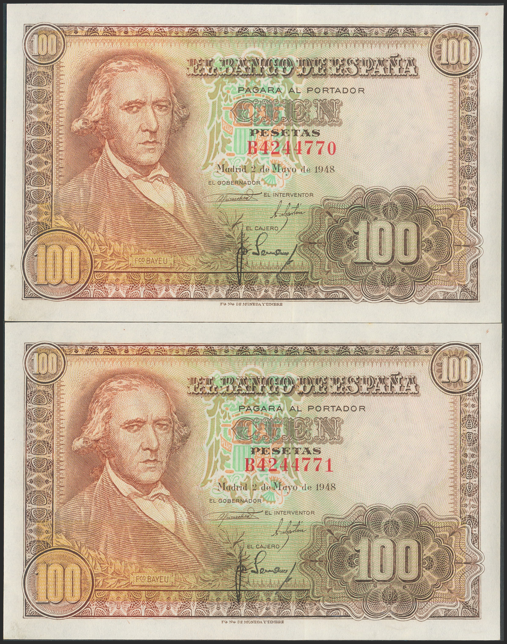 100 Pesetas. 2 de Mayo de 1948. Pareja correlativa. Serie B. (Edifil 2017: 456a). Inusual y apresto original. SC.