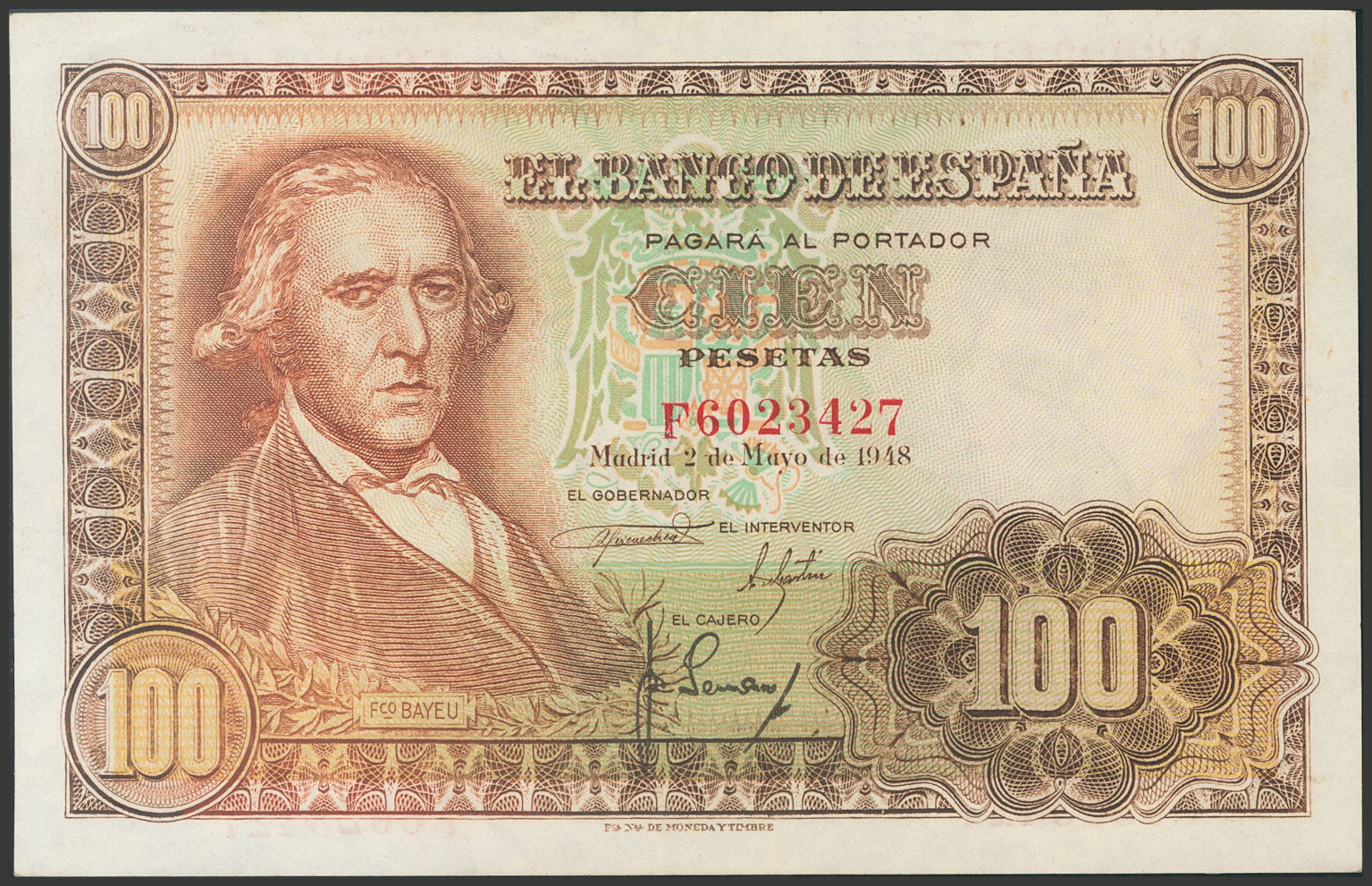 100 Pesetas. 2 de Mayo de 1948. Serie F. (Edifil 2017: 456a). Conserva gran parte del apresto original. EBC+.