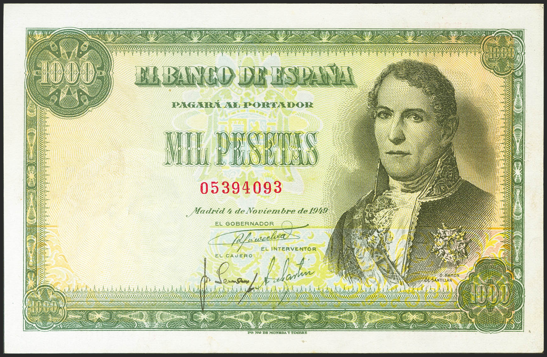 1000 Pesetas. 4 de Noviembre de 1949. Sin serie. (Edifil 2021: 458). Inusual en esta calidad, conserva gran parte del apresto original. EBC+.