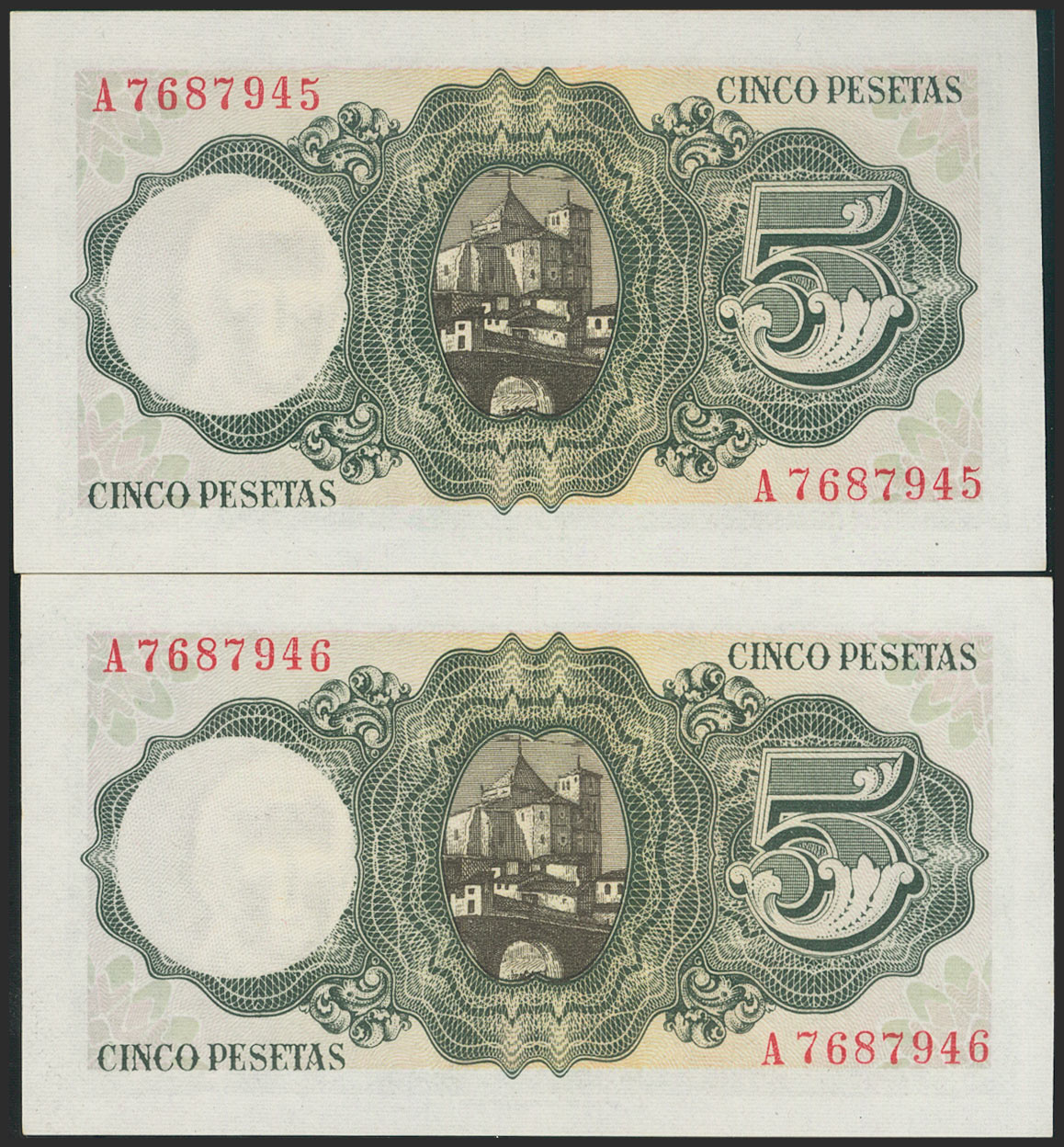 5 Pesetas. 16 de Agosto de 1951. Pareja correlativa. Serie A. (Edifil 2021: 459a). Apresto original. SC.