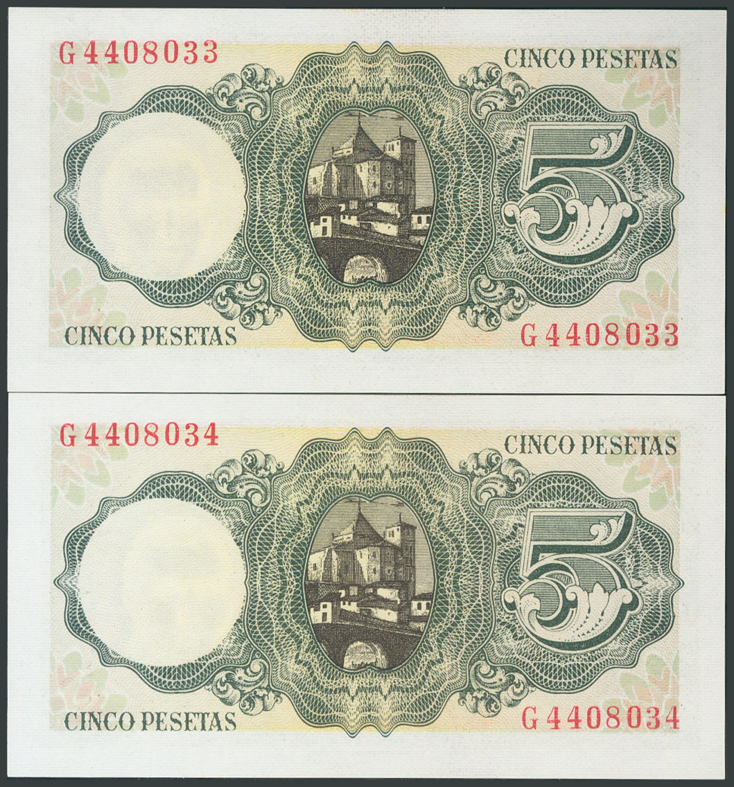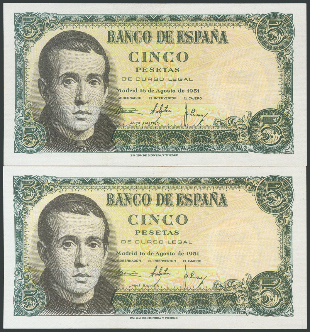 5 Pesetas. 16 de Agosto de 1951. Pareja correlativa. Serie G. (Edifil 2017: 459a). Apresto original. SC.