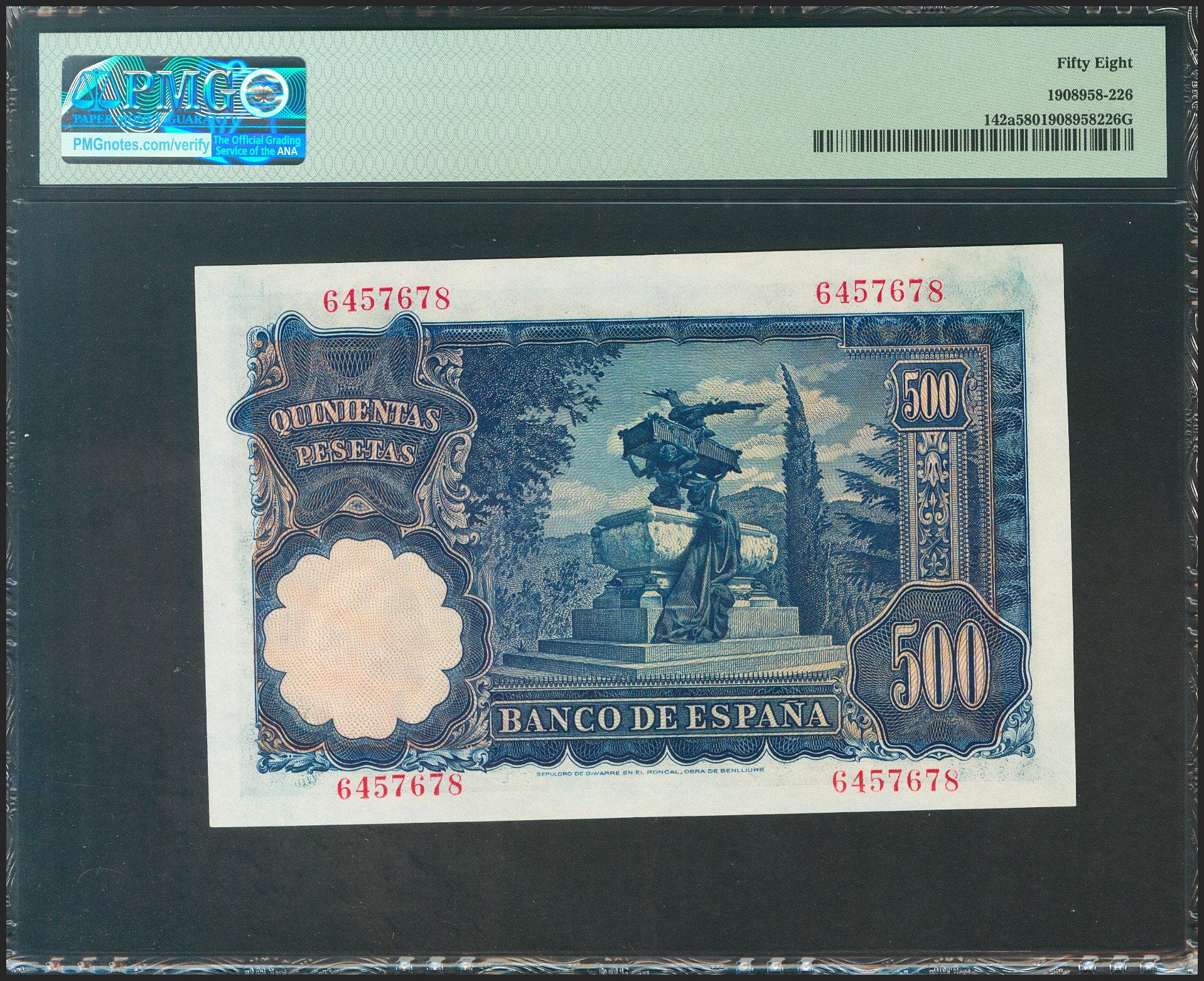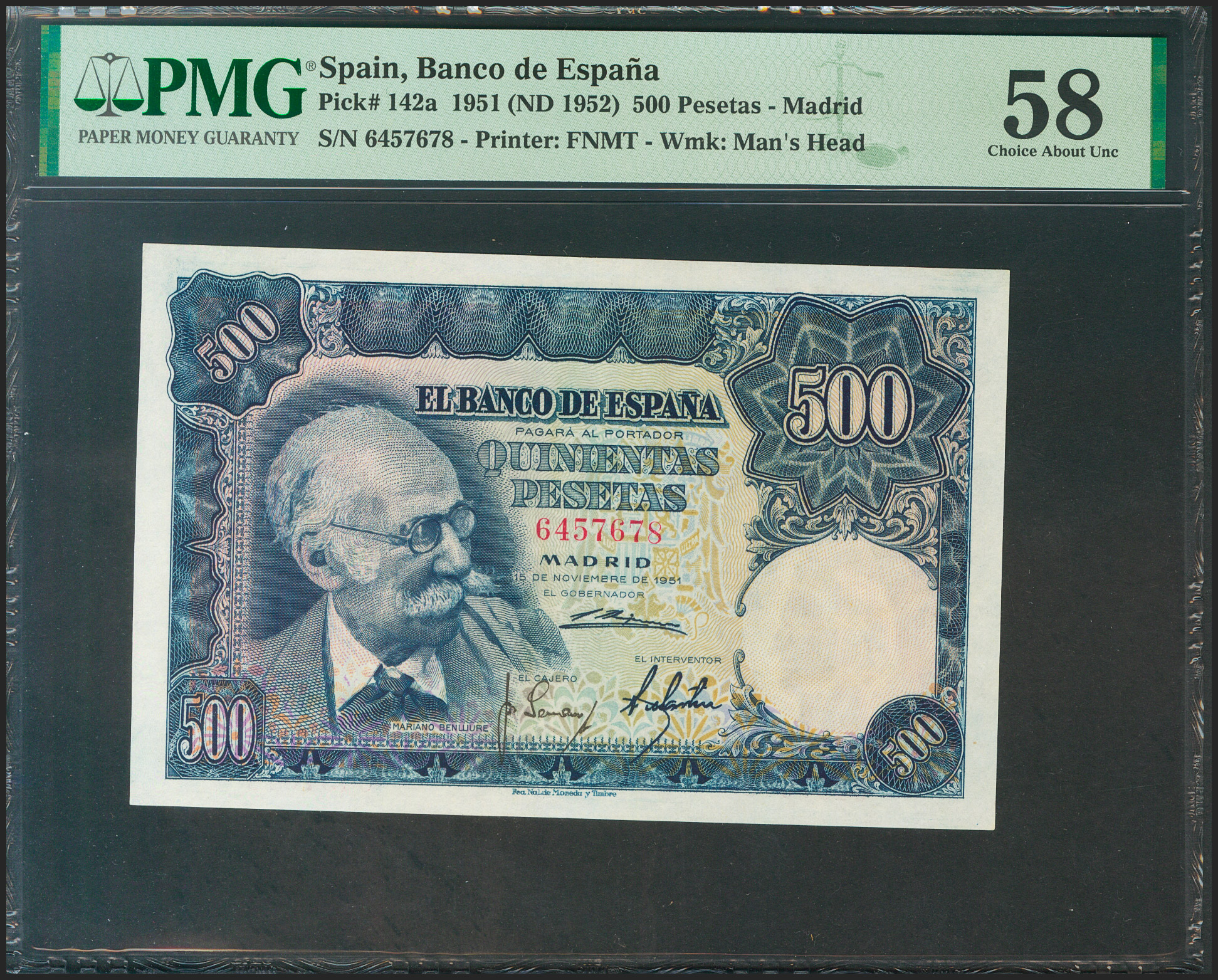500 Pesetas. 15 de Noviembre de 1951. Sin serie. (Edifil 2021: 460, Pick: 142a). Inusual en esta calidad. EBC++. Encapsulado PMG58.