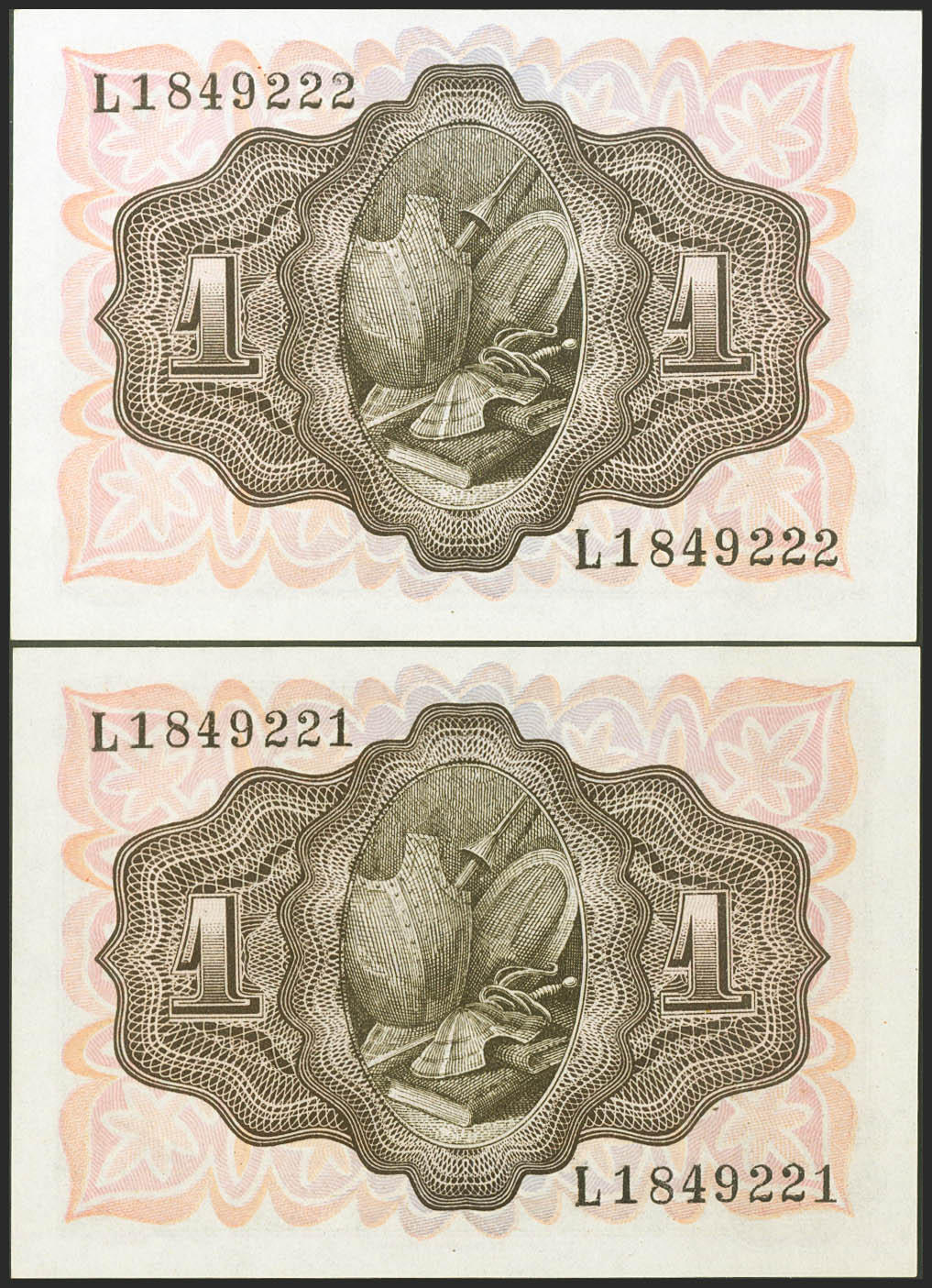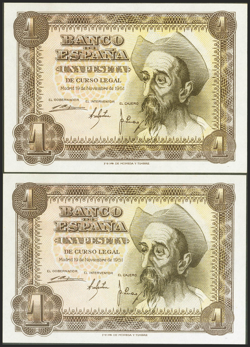 1 Peseta. 19 de Noviembre de 1951. Pareja correlativa. Serie L. (Edifil 2021: 461a). Apresto original. SC.