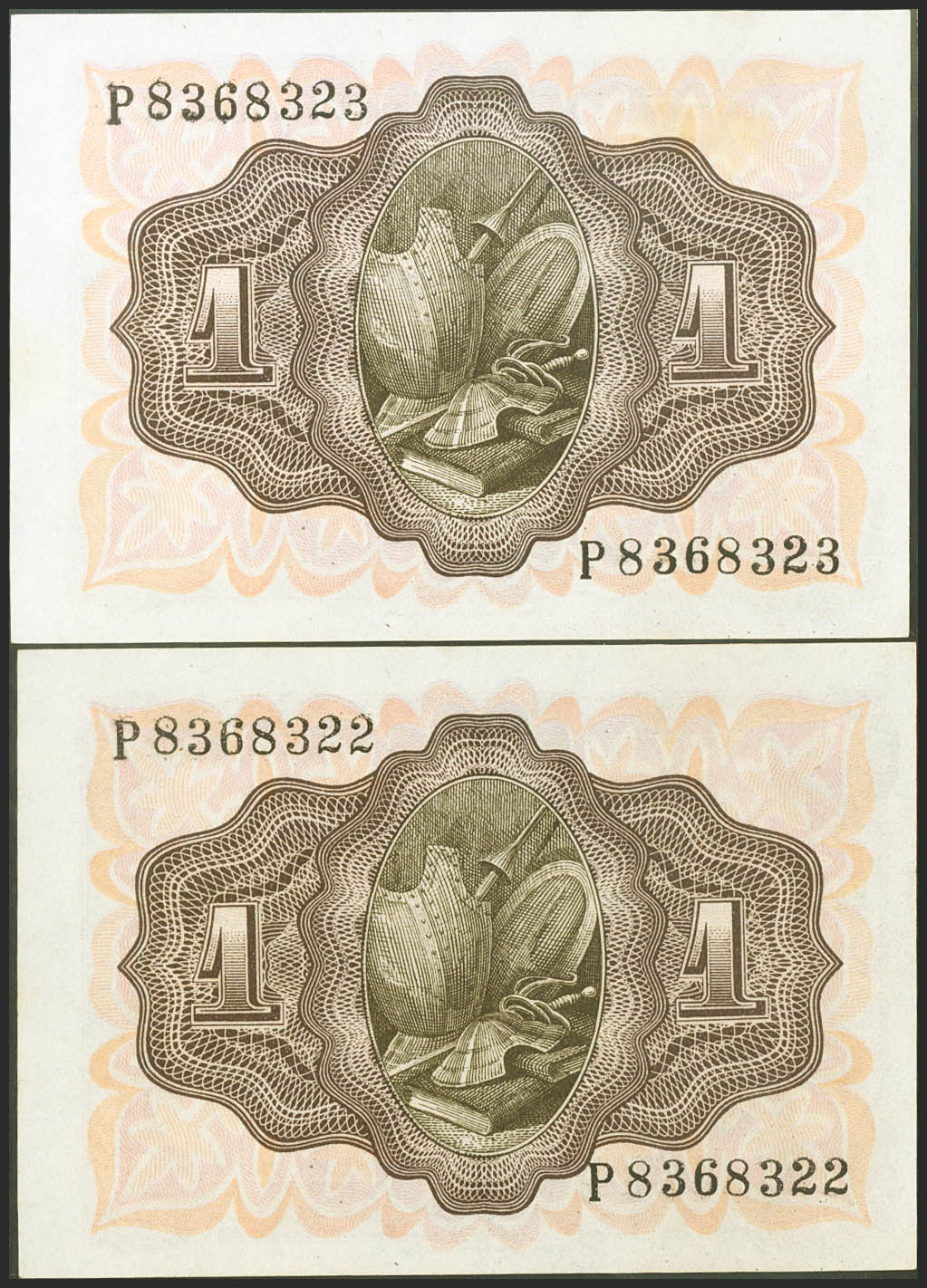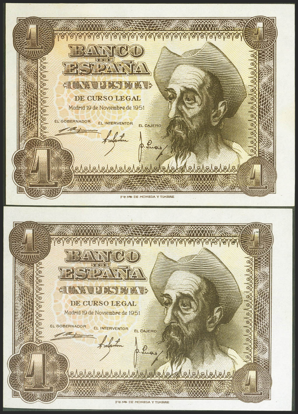 1 Peseta. 19 de Noviembre de 1951. Pareja correlativa. Serie P. (Edifil 2021: 461a). Apresto original. EBC++.