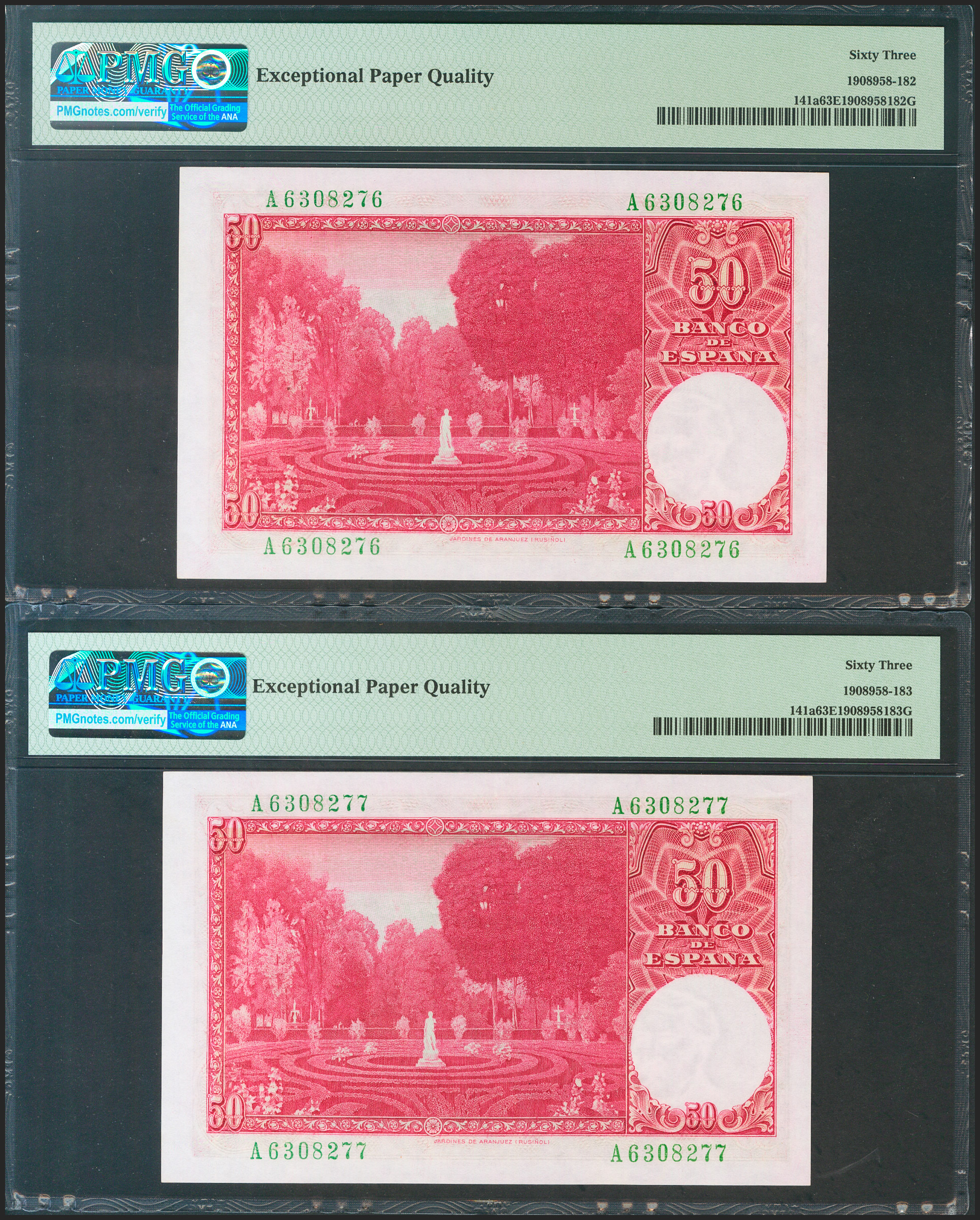 50 Pesetas. 31 de Diciembre de 1951. Pareja correlativa. Serie A. (Edifil 2021: 462a, Pick: 141a). Inusual en esta calidad, apresto original. SC. Encapsulado PMG63EPQ, ambos.
