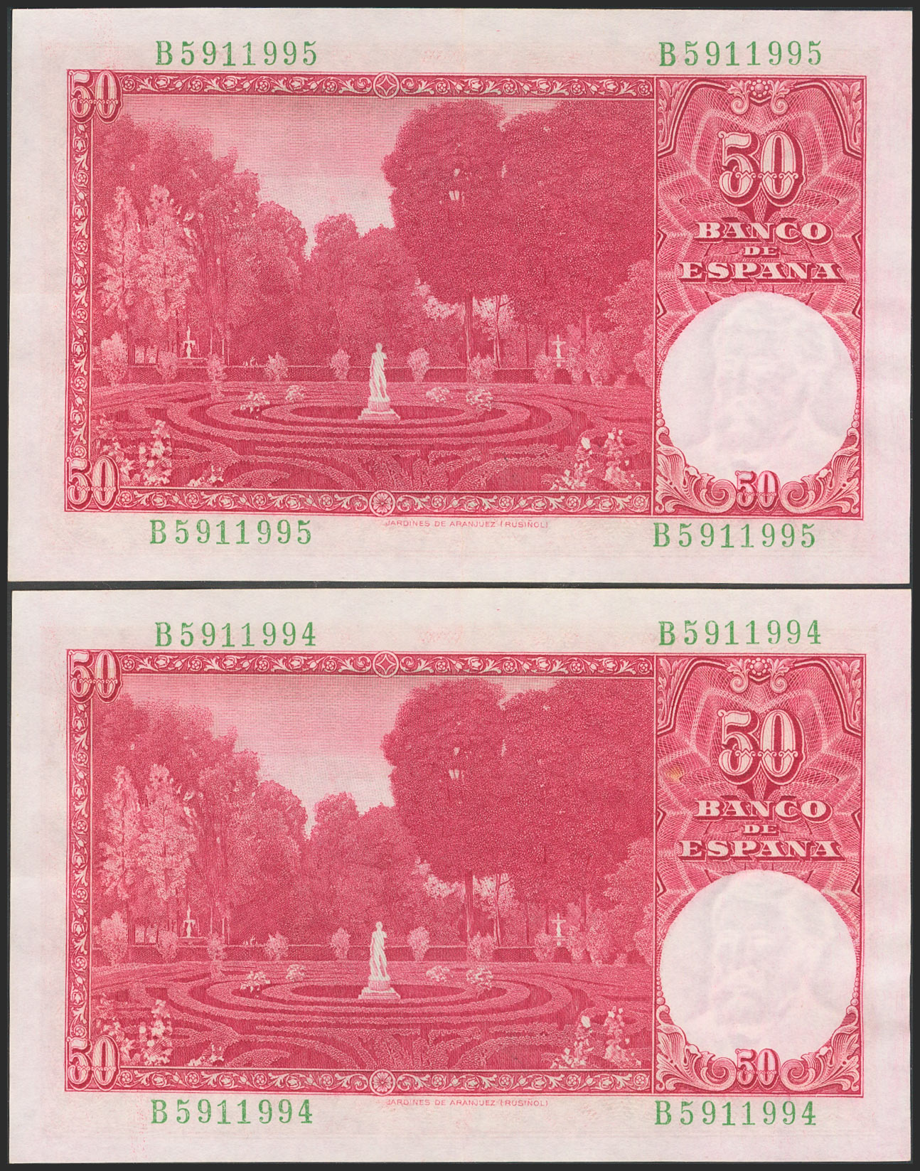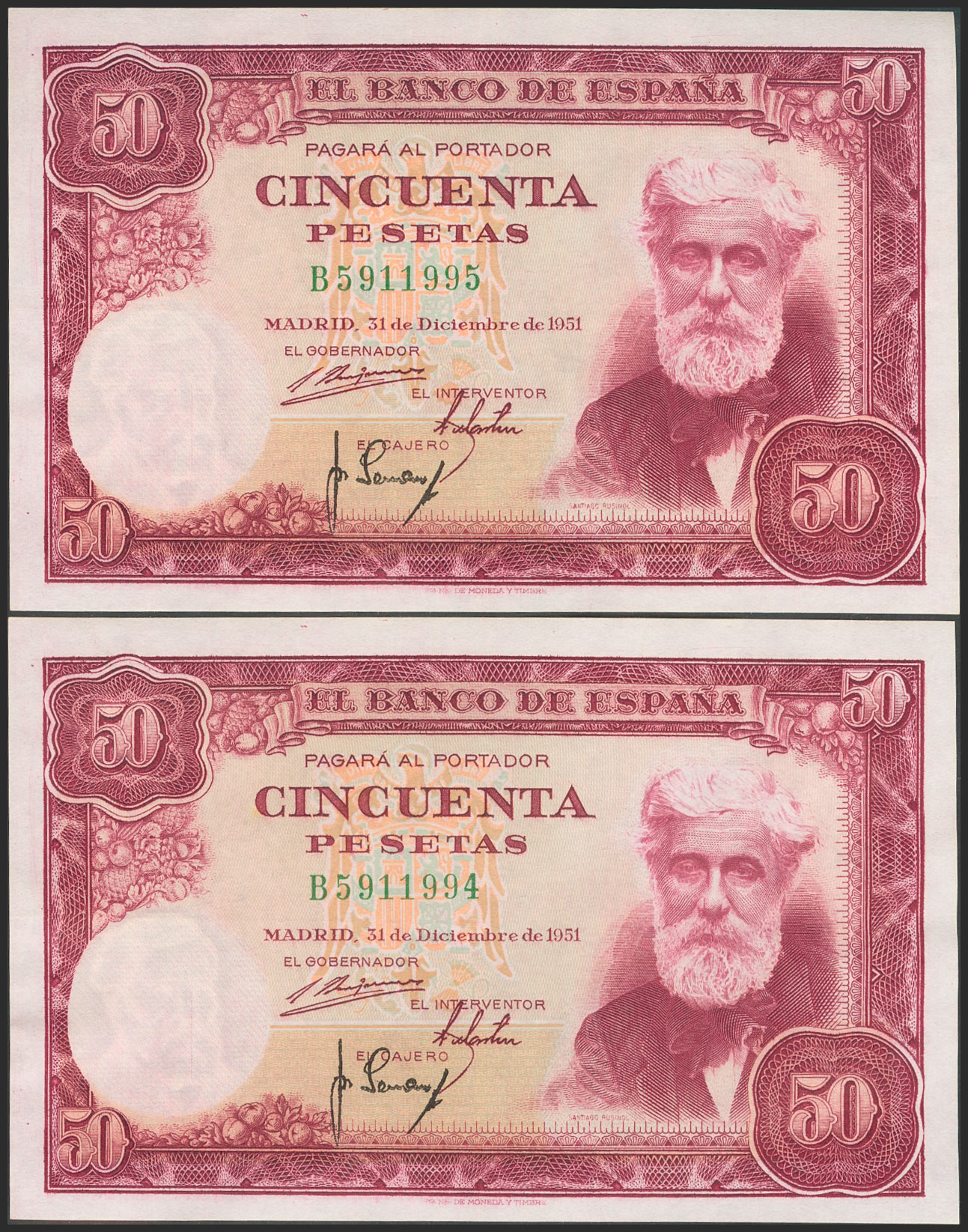 50 Pesetas. 31 de Diciembre de 1951. Pareja correlativa. Serie B. (Edifil 2021: 462a). Conserva gran parte del apresto original. EBC+.
