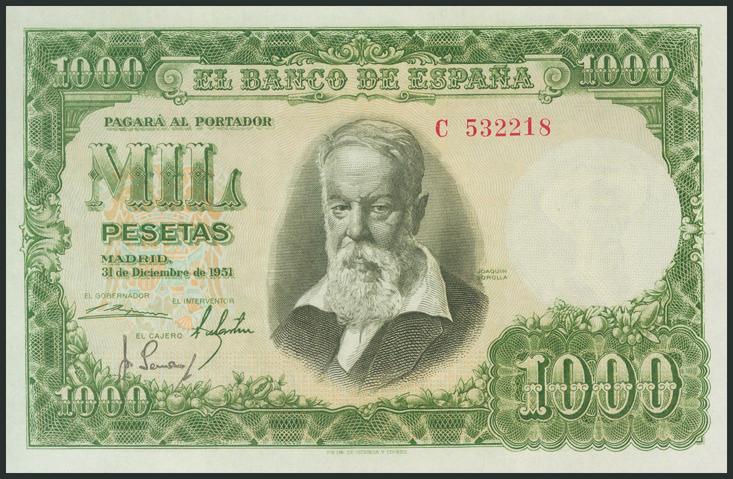 1000 Pesetas. 31 de Diciembre de 1951. Serie C, última serie emitida. (Edifil 2017: 463a). Conserva todo su apresto original. EBC+.