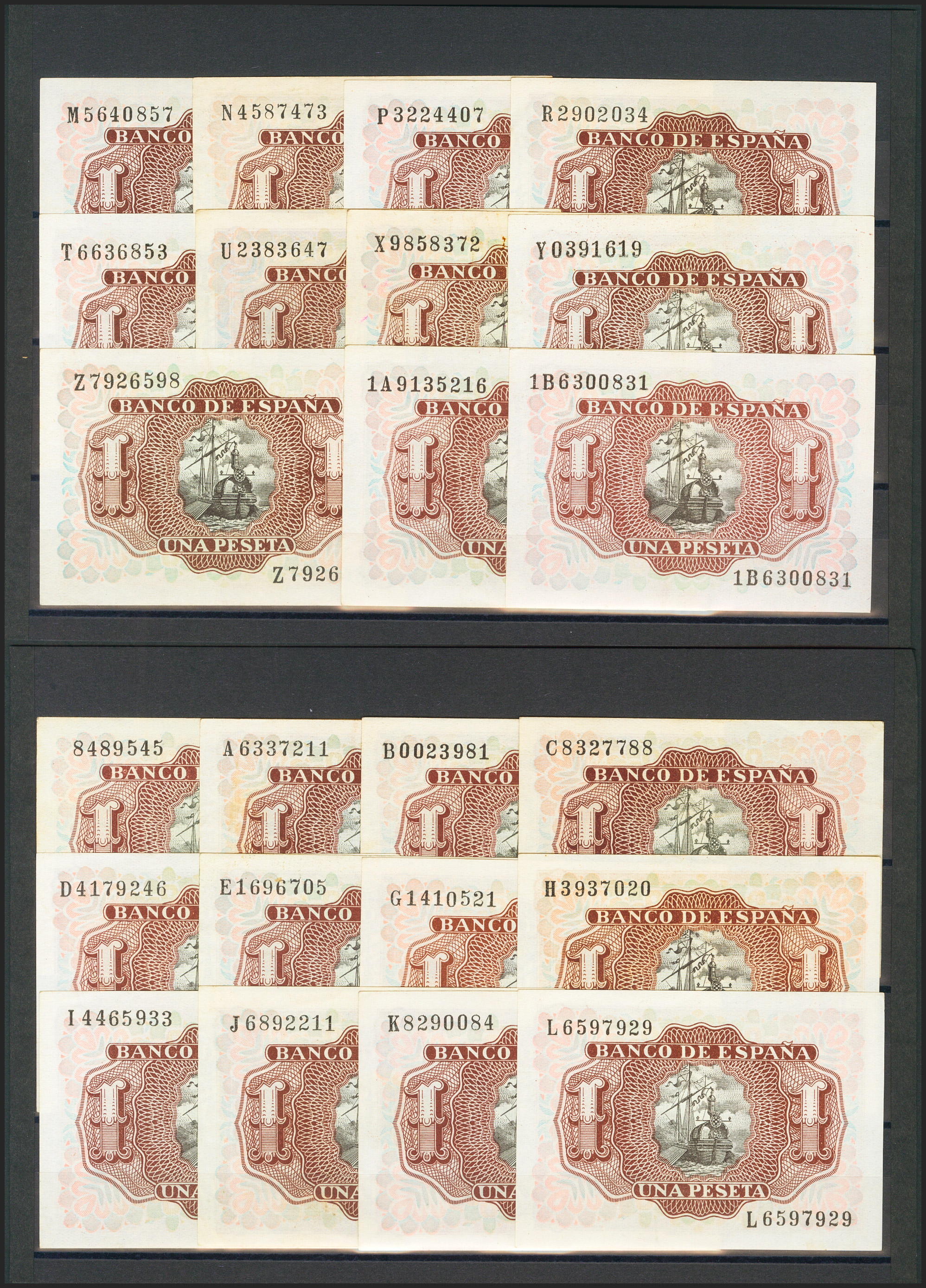 Precioso conjunto de 23 billetes de 1 Peseta emitidos el 22 de Junio de 1953, incluyendo todas las letras de la serie inicial, a excepción de la F, Q, S, V, W e incluyendo el sin serie (sin serie EBC, A EBC, B EBC-, C EBC, D EBC, E EBC+, G SC-, H EBC+, I EBC+, J SC-, K EBC+, L EBC, M RC, N EBC, P EBC, R EBC+, T EBC+, U EBC+, X EBC, Y EBC, Z EBC), además el 1A EBC y 1B EBC, de la segunda serie. (Edifil 2021: 465, 465a, 465b). Inusual conjunto.