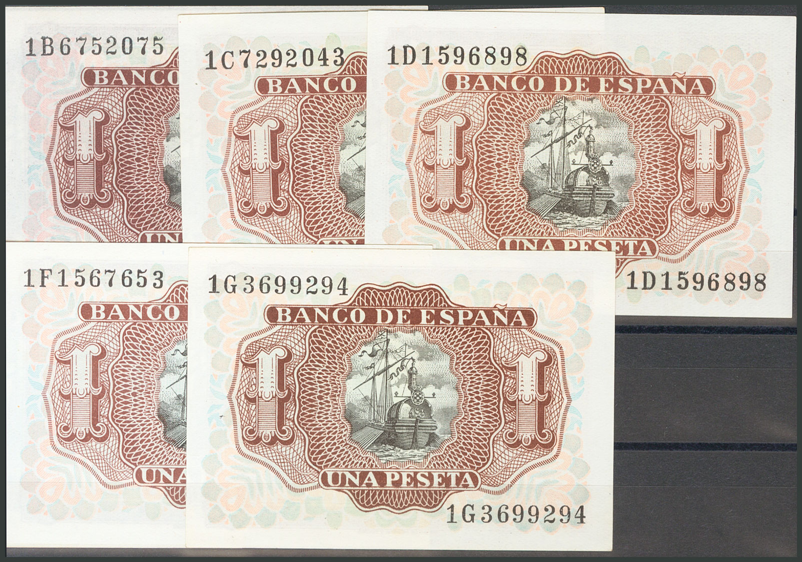 Precioso e interesante conjunto de 7 billetes de 1 Peseta emitidos el 22 de Julio de 1953, incluyendo todas las letras de la segunda emisión (1A, 1B, 1C, 1D, 1E, 1F y 1G). (Edifil 2017: 465a). Raro conjunto y de muy buena calidad, todos los billetes presentan apresto original. SC/SC-.