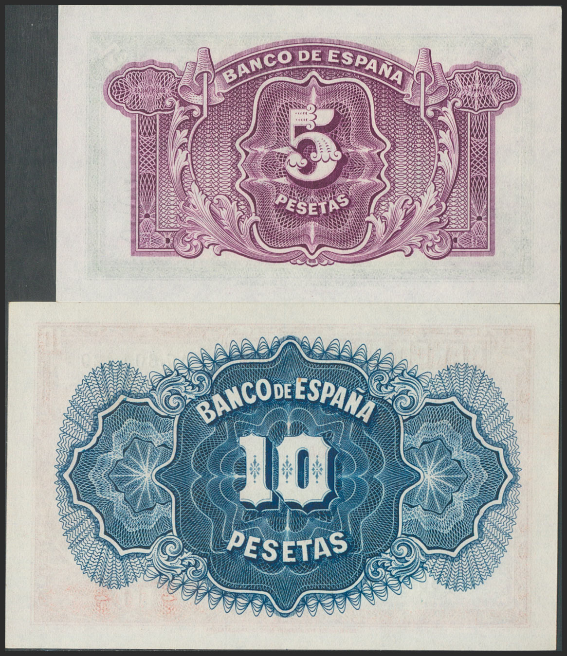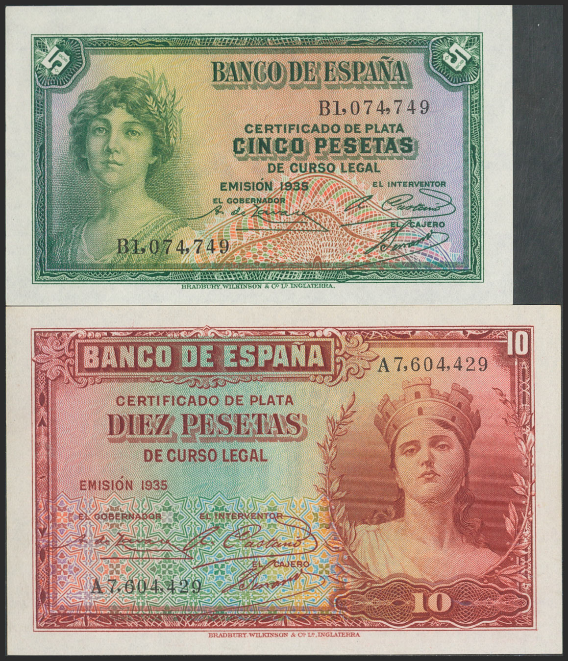 5 Pesetas y 10 Pesetas. 1935. Serie B y A, respectivamente. (Edifil 2017: 363a, 364a). Apresto original. SC.