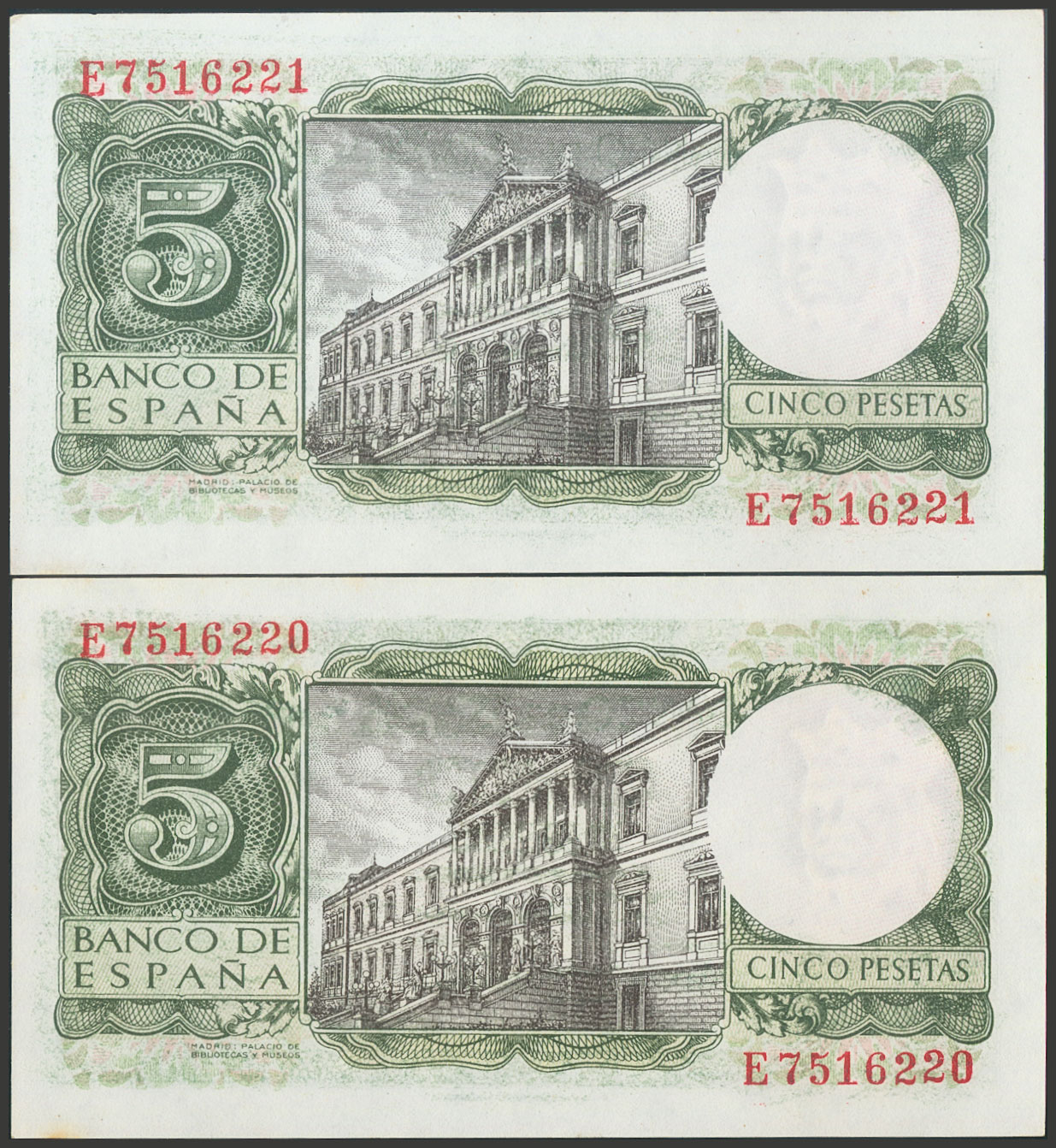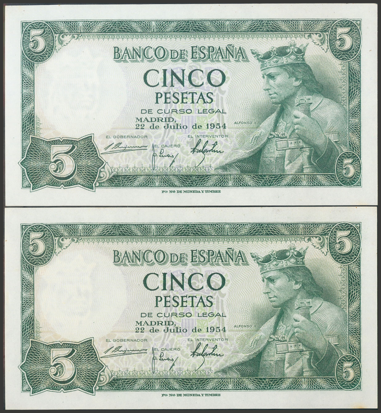 5 Pesetas. 22 de Julio de 1954. Pareja correlativa. Serie E. (Edifil 2017: 466a). Puntitos. SC-.