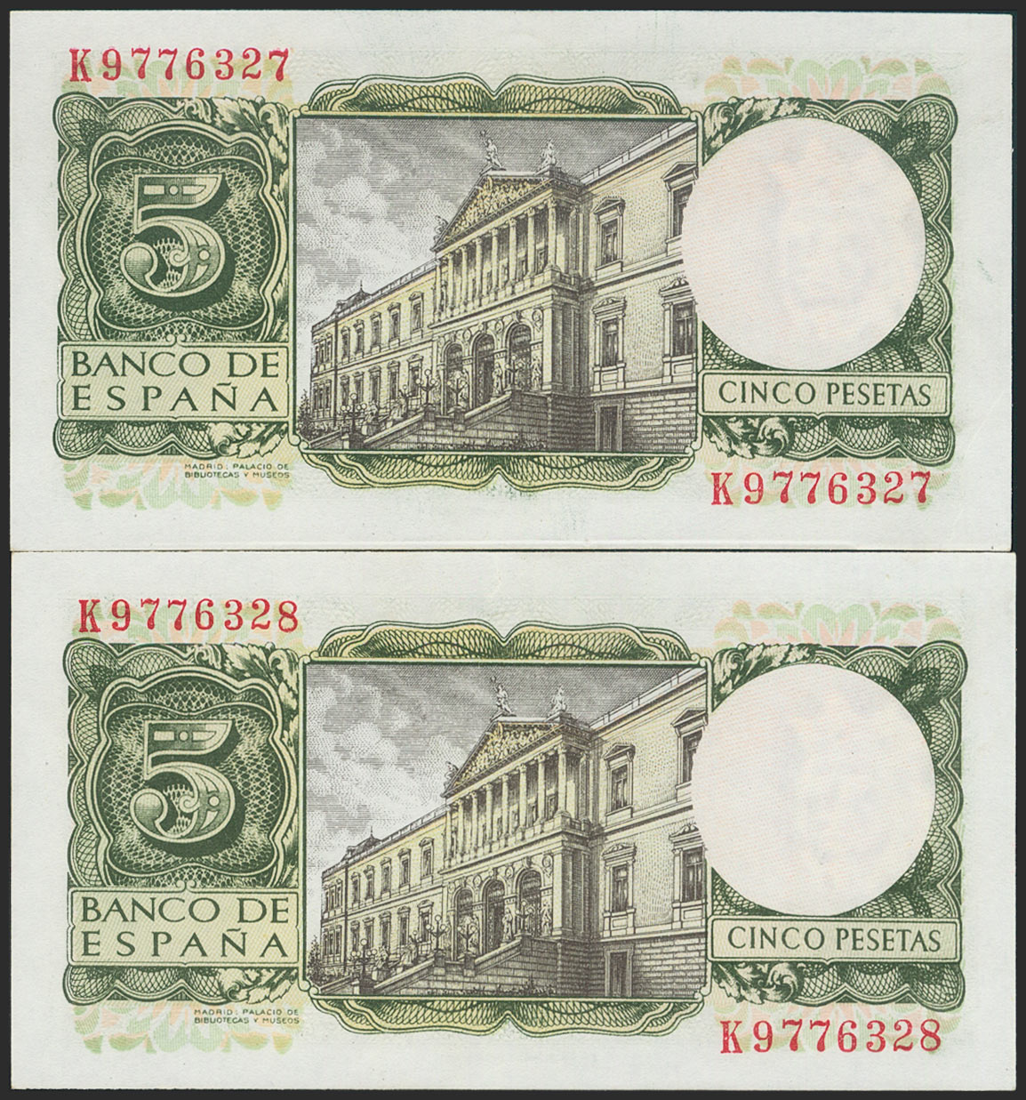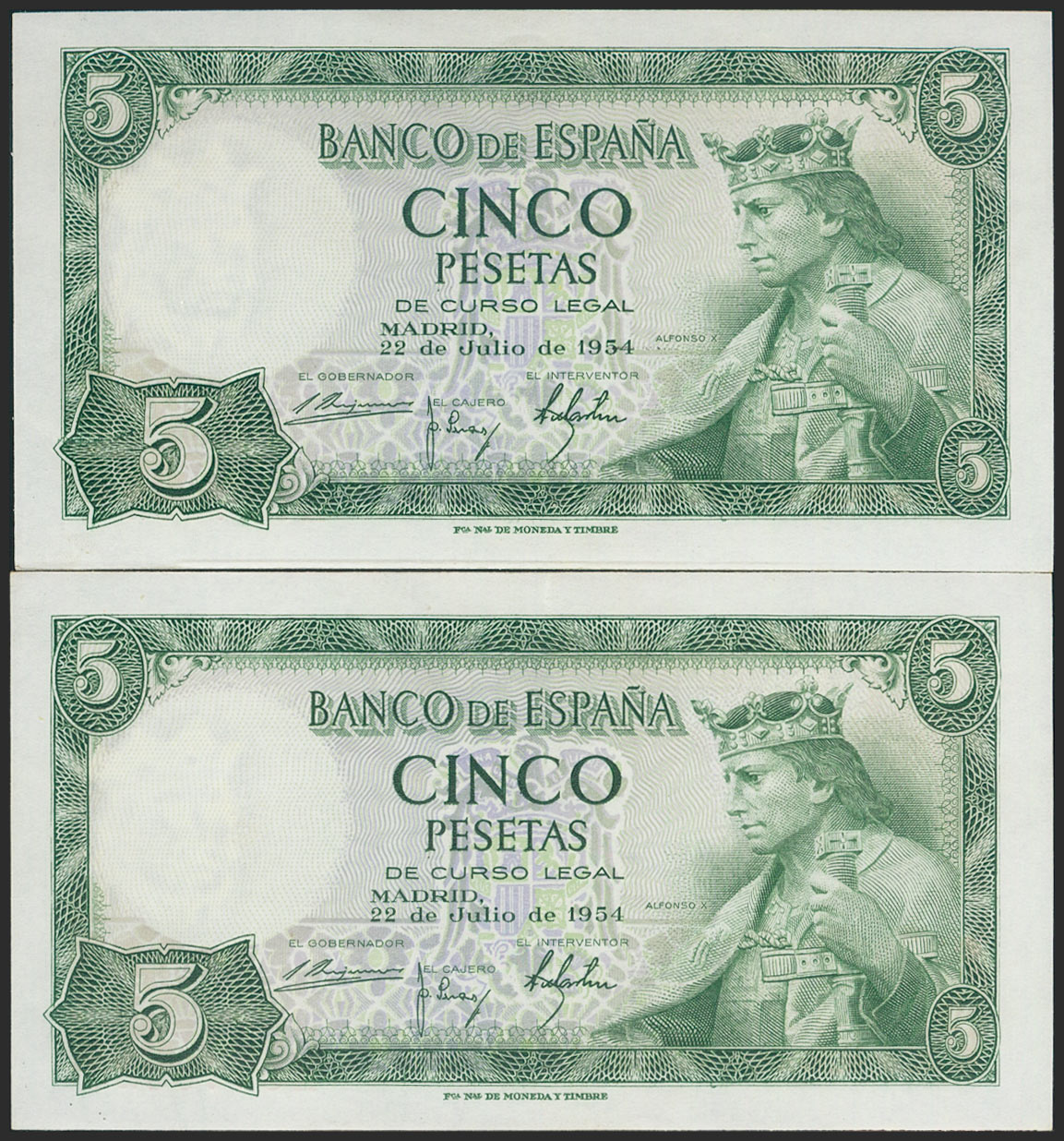 5 Pesetas. 22 de Julio de 1954. Pareja correlativa. Serie K. (Edifil 2021: 466a). Apresto original. SC-.