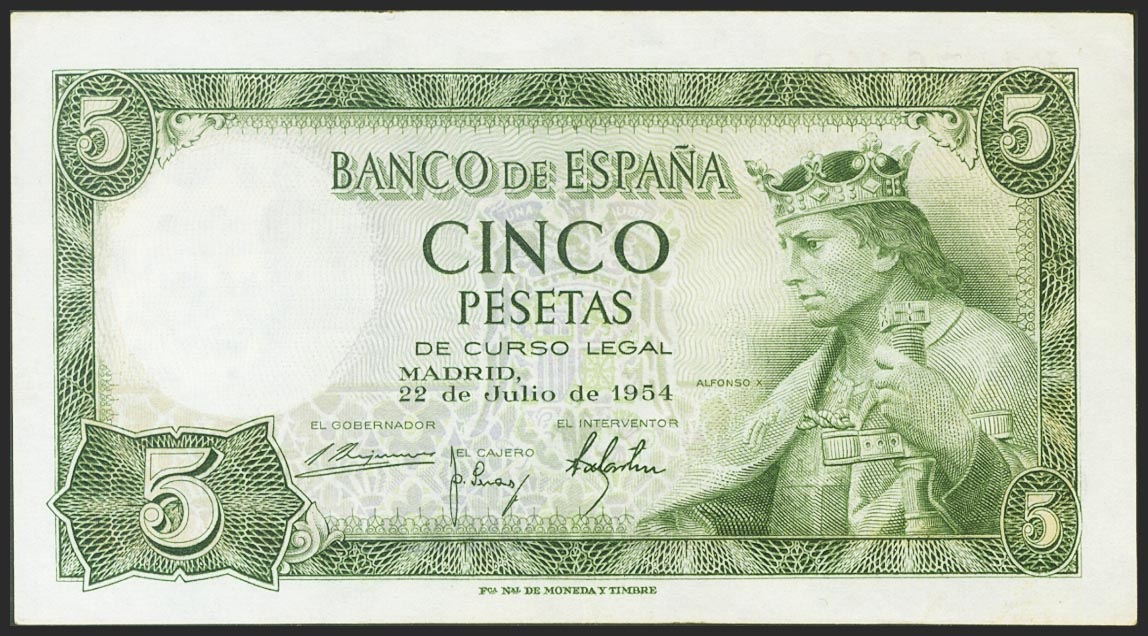 5 Pesetas. 22 de Julio de 1954. Serie K. (Edifil 2021: 466a). Conserva parte del apresto original. EBC.