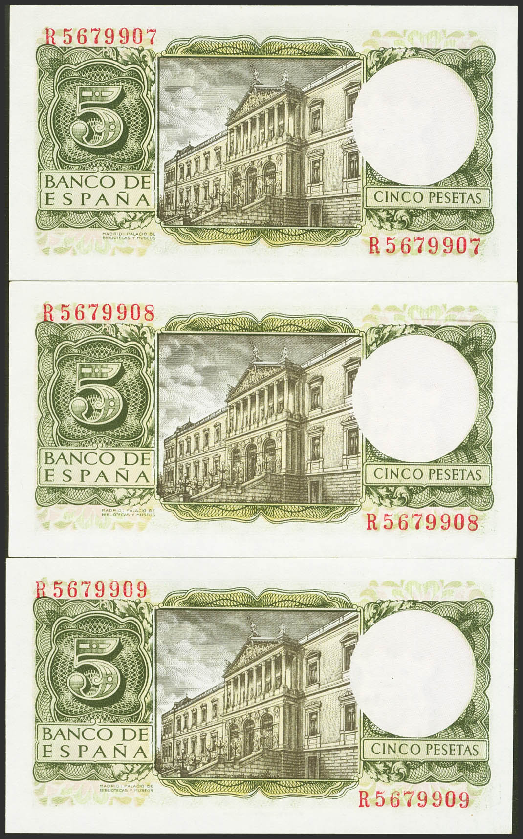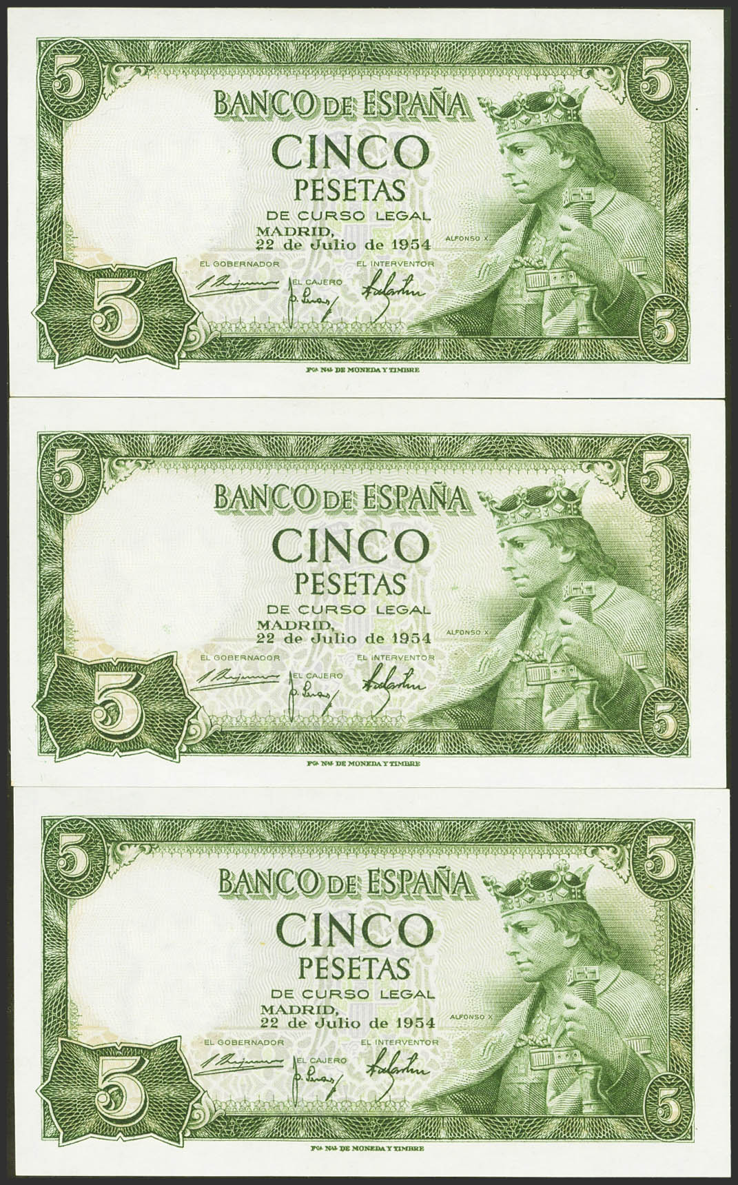 5 Pesetas. 22 de Julio de 1954. Trío correlativo. Serie R. (Edifil 2017: 466a). Apresto original. SC/SC-.