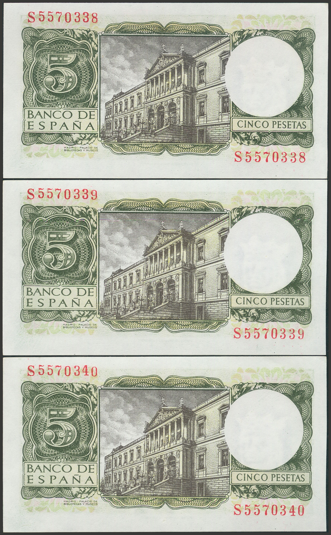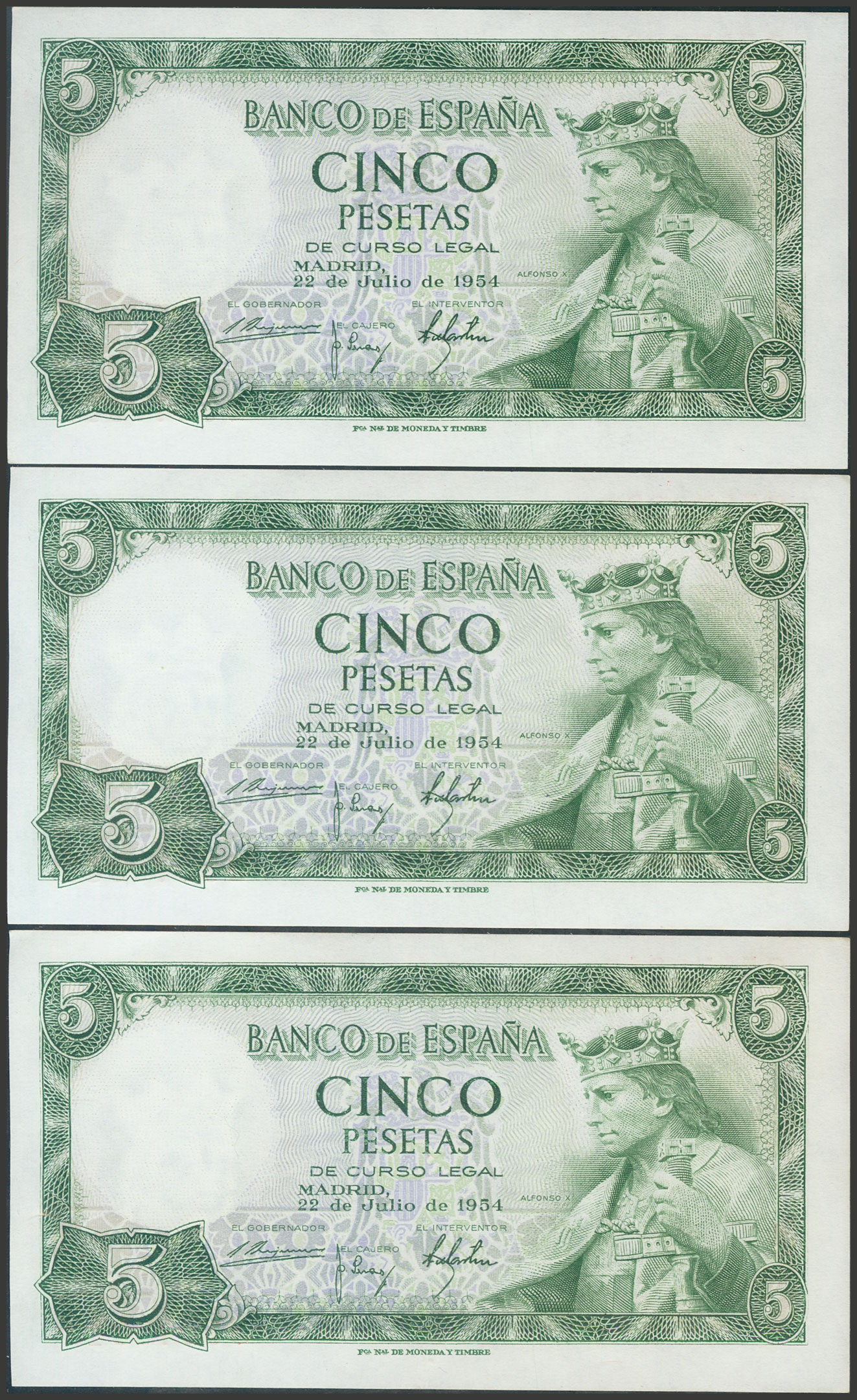 5 Pesetas. 22 de Julio de 1954. Trío correlativo. Serie S. (Edifil 2017: 466a). Apresto original. SC/SC-.