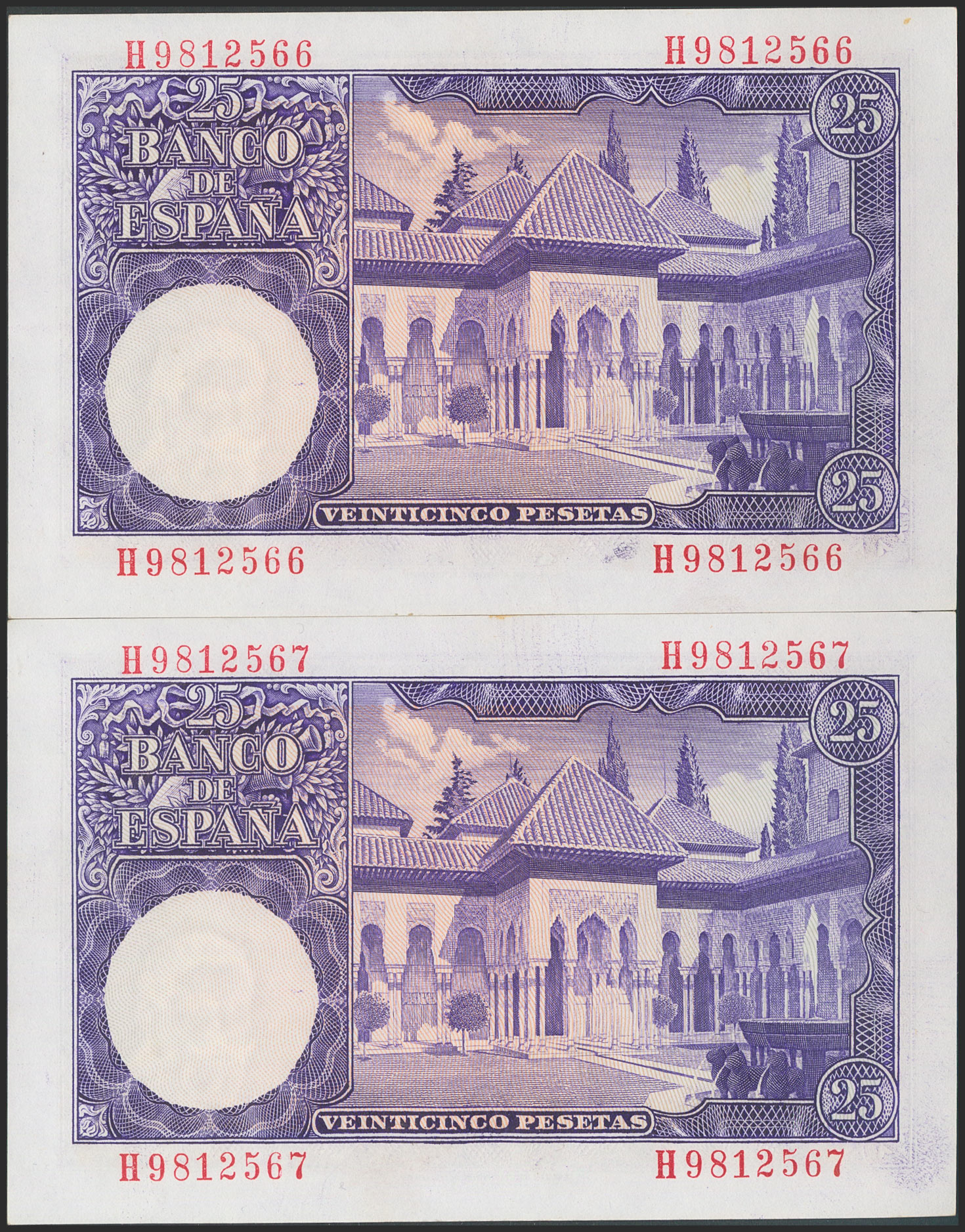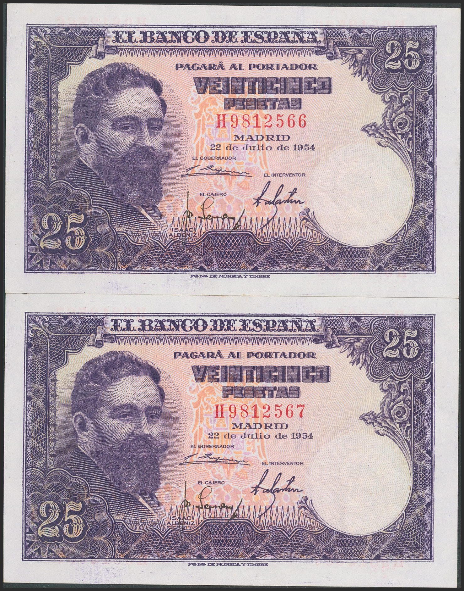 25 Pesetas. 22 de Julio de 1954. Pareja correlativa. Serie H. (Edifil 2017: 467a). Conserva todo su apresto original. SC-.