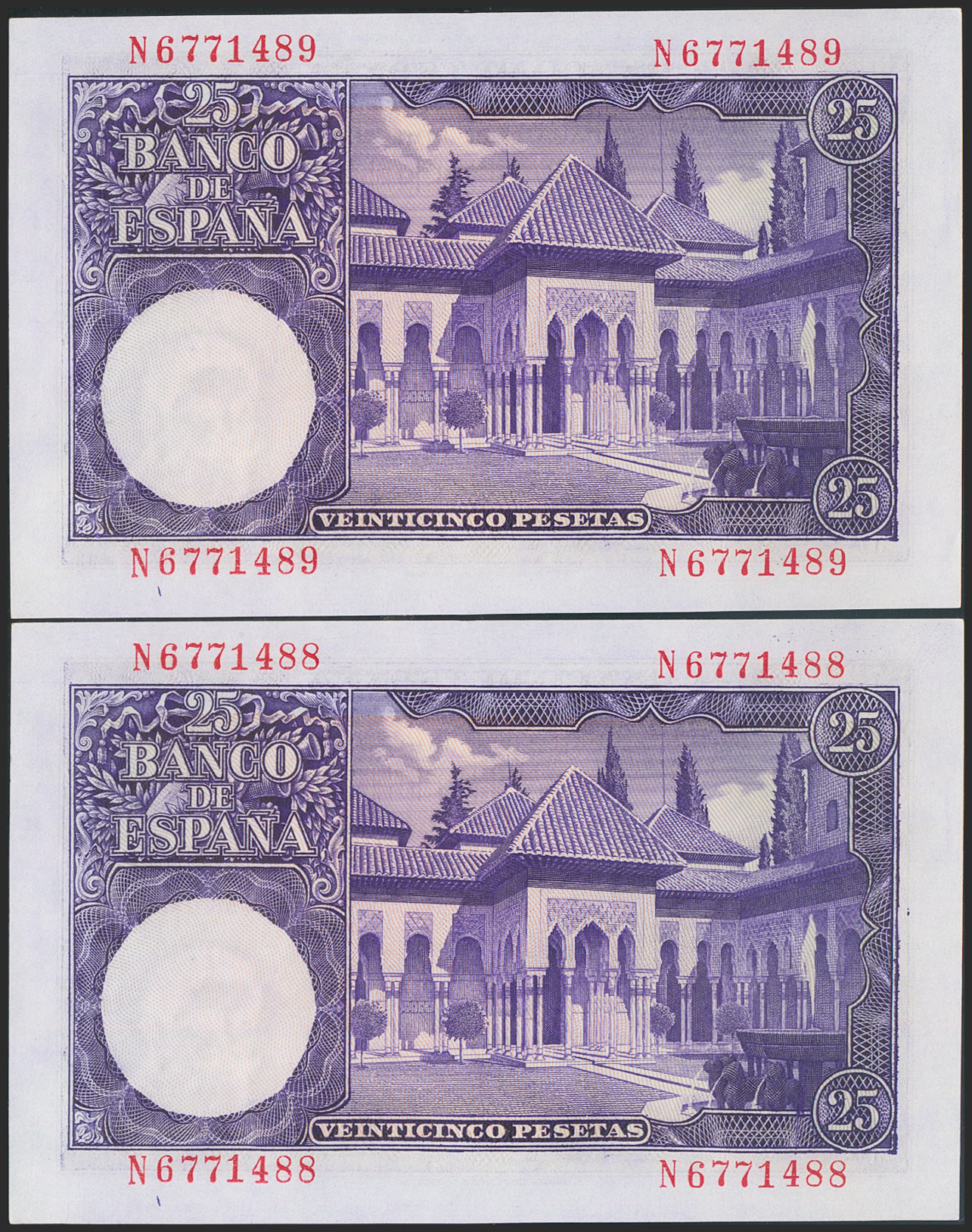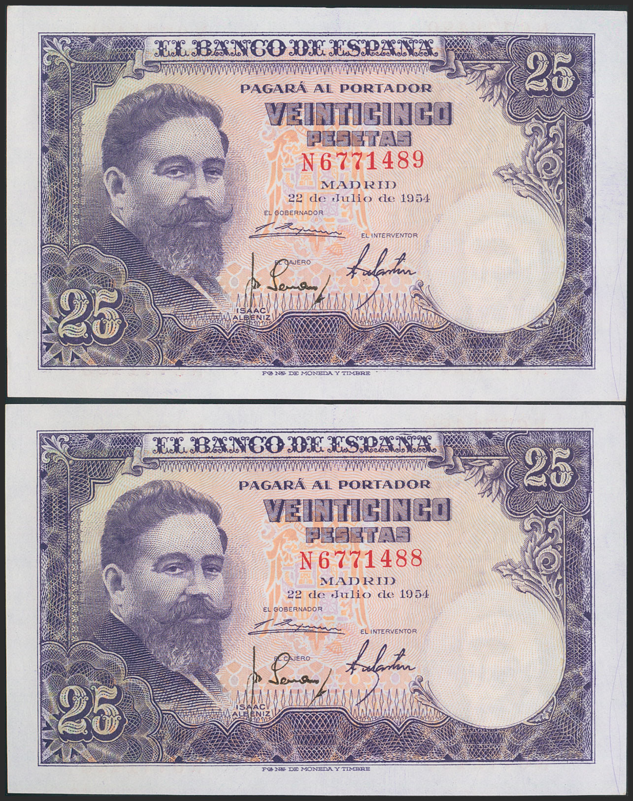 25 Pesetas. 22 de Julio de 1954. Pareja correlativa. Serie N. (Edifil 2021: 467a). Apresto original. SC.