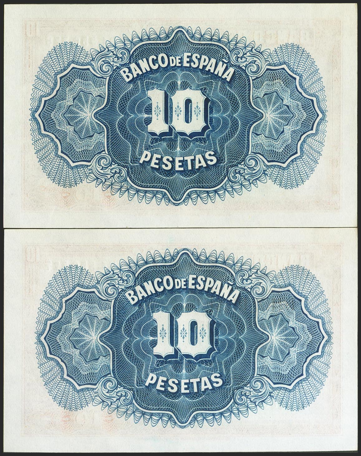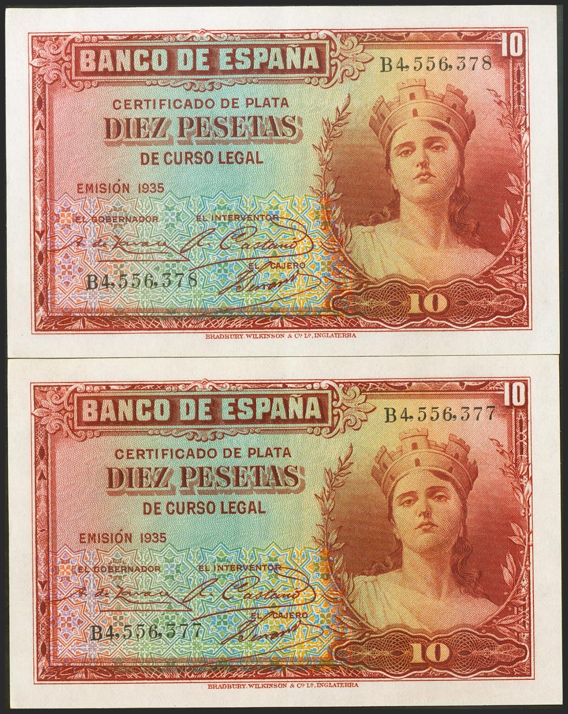 10 Pesetas. 1935. Pareja correlativa. Certificado de Plata. Serie B. (Edifil 2021: 364a). Conserva todo su apresto original. EBC+.