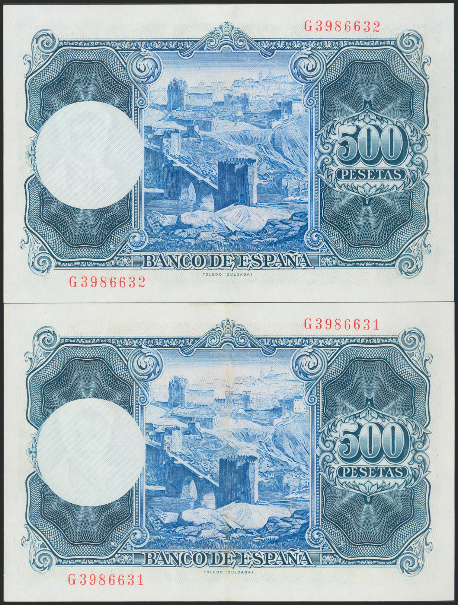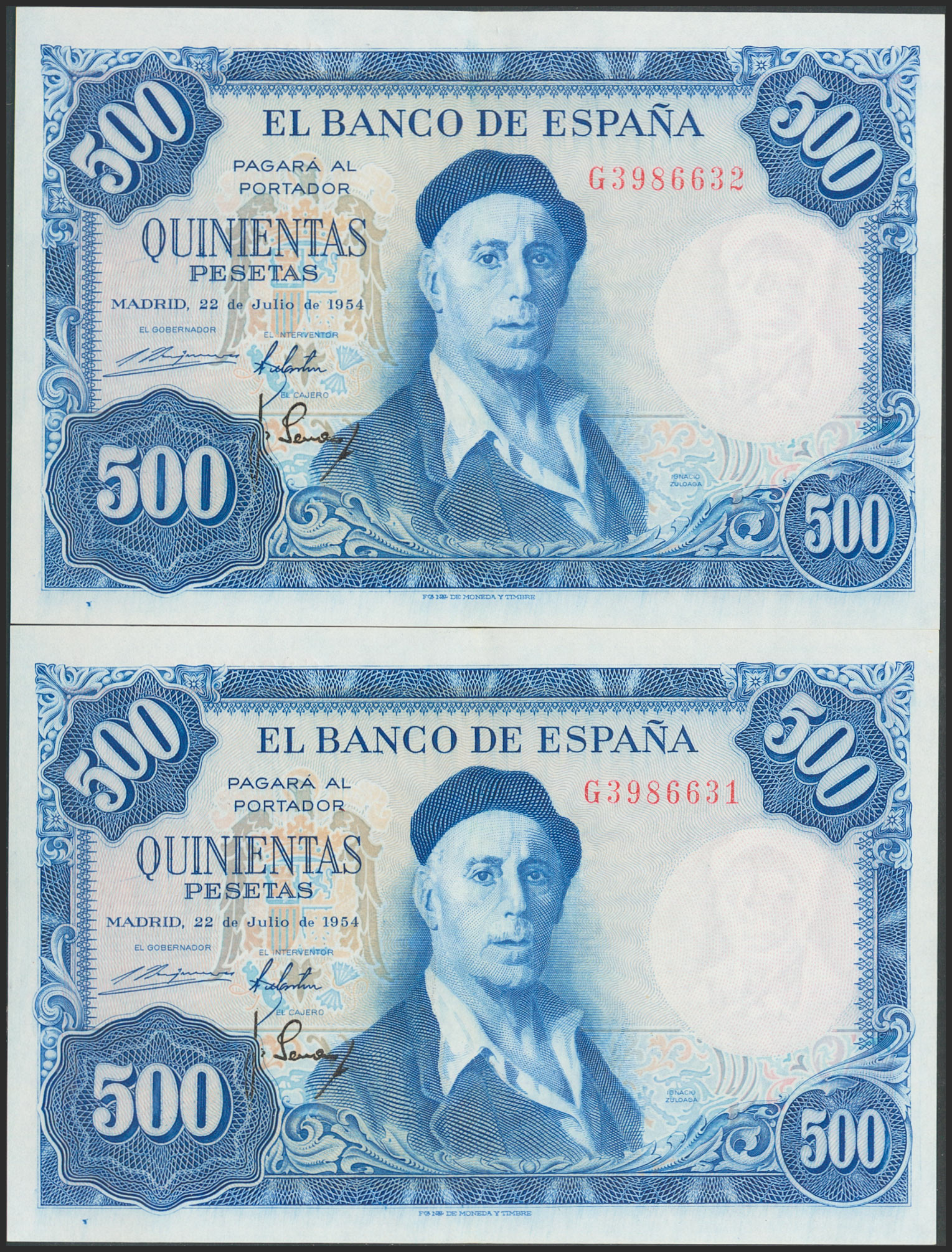 500 Pesetas. 22 de Julio de 1954. Pareja correlativa. Serie G. (Edifil 2017: 468b). Conserva gran parte del apresto original. EBC.
