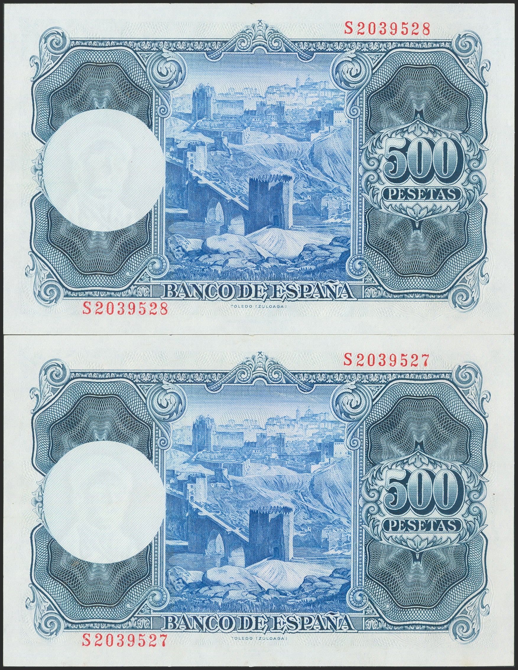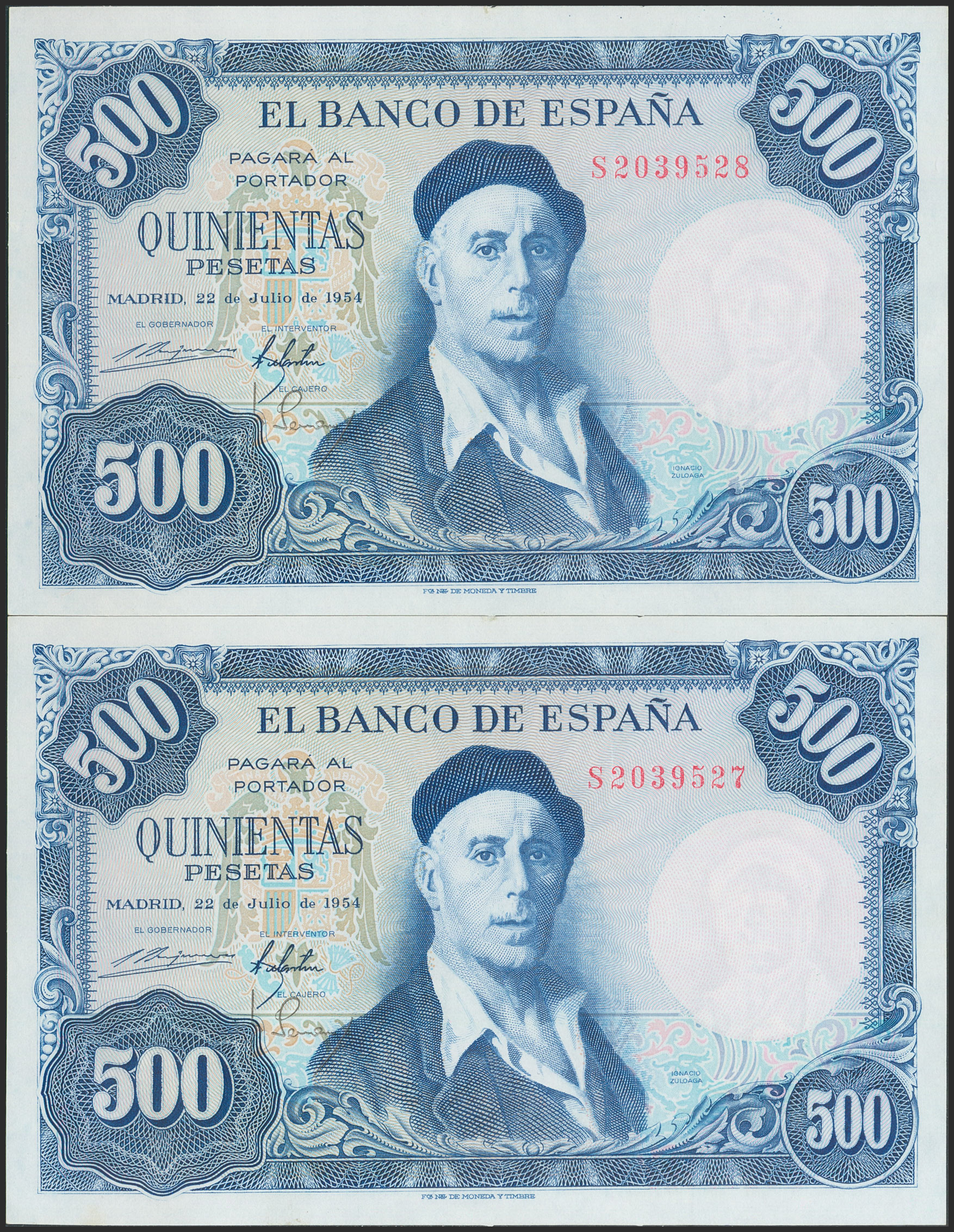 500 Pesetas. 22 de Julio de 1954. Pareja correlativa. Serie S. (Edifil 2021: 468b). Apresto original. SC-.