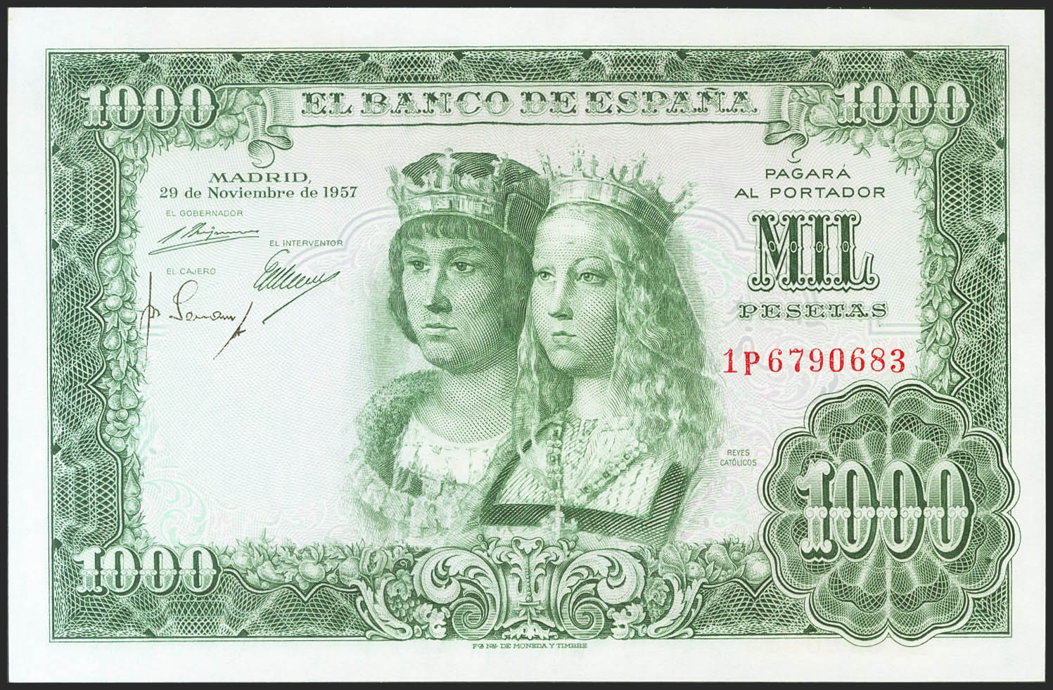 1000 Pesetas. 29 de Noviembre de 1957. Serie 1P. (Edifil 2021: 469b). Conserva todo su apresto original. SC.