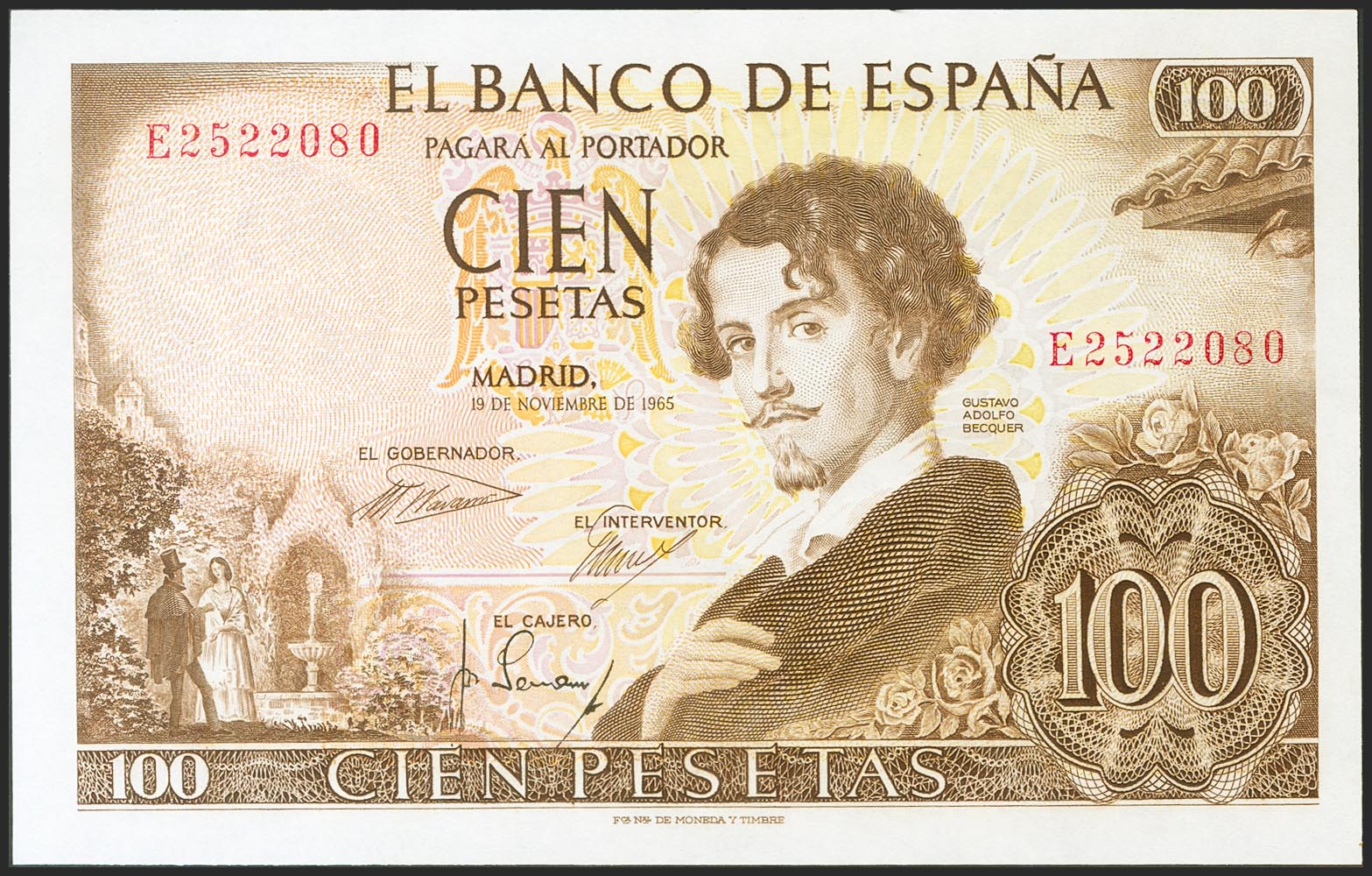 100 Pesetas. 19 de Noviembre de 1965. Serie E. (Edifil 2021: 470a). Apresto original. SC.