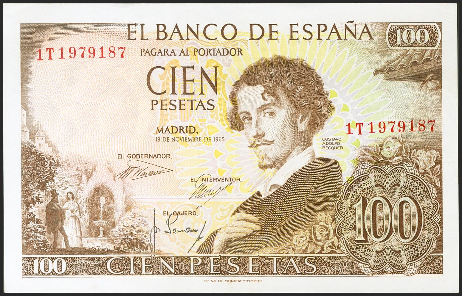 100 Pesetas. 19 de Noviembre de 1965. Serie 1T, última serie emitida. (Edifil 2021: 470a). Conserva la mayor parte del apresto original. EBC+.