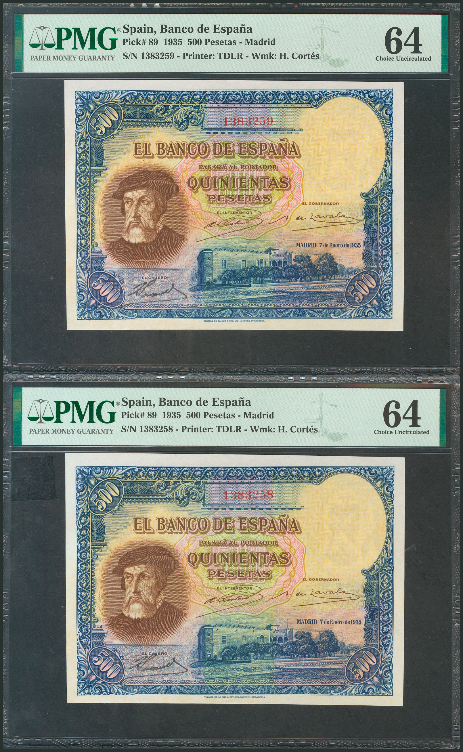 500 Pesetas. 7 de Enero de 1935. Pareja correlativa. Sin serie. (Edifil 2017: 365). SC. Encapsulado PMG64, ambos.