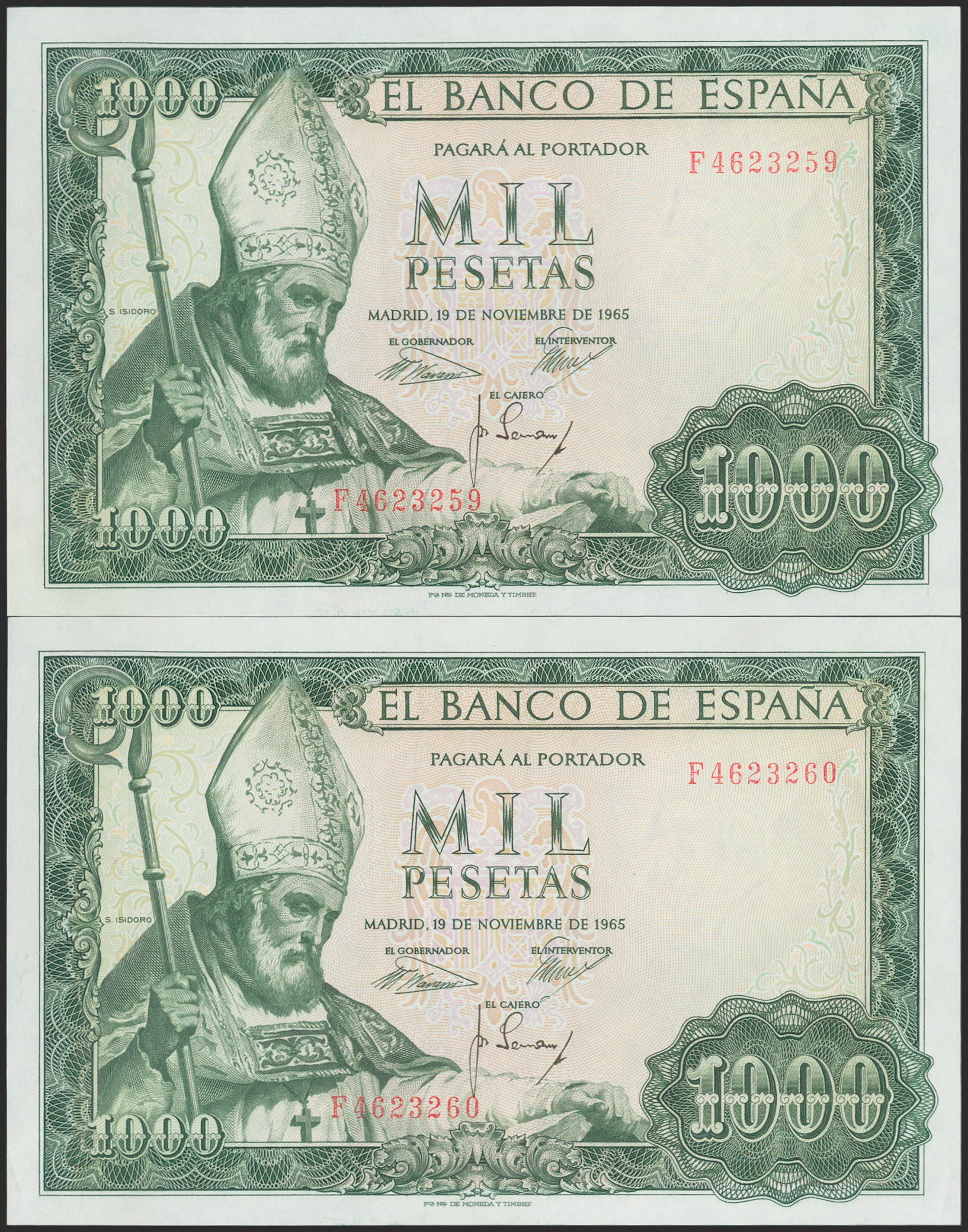 1000 Pesetas. 19 de Noviembre de 1965. Pareja correlativa. Serie F. (Edifil 2017: 471b). SC.