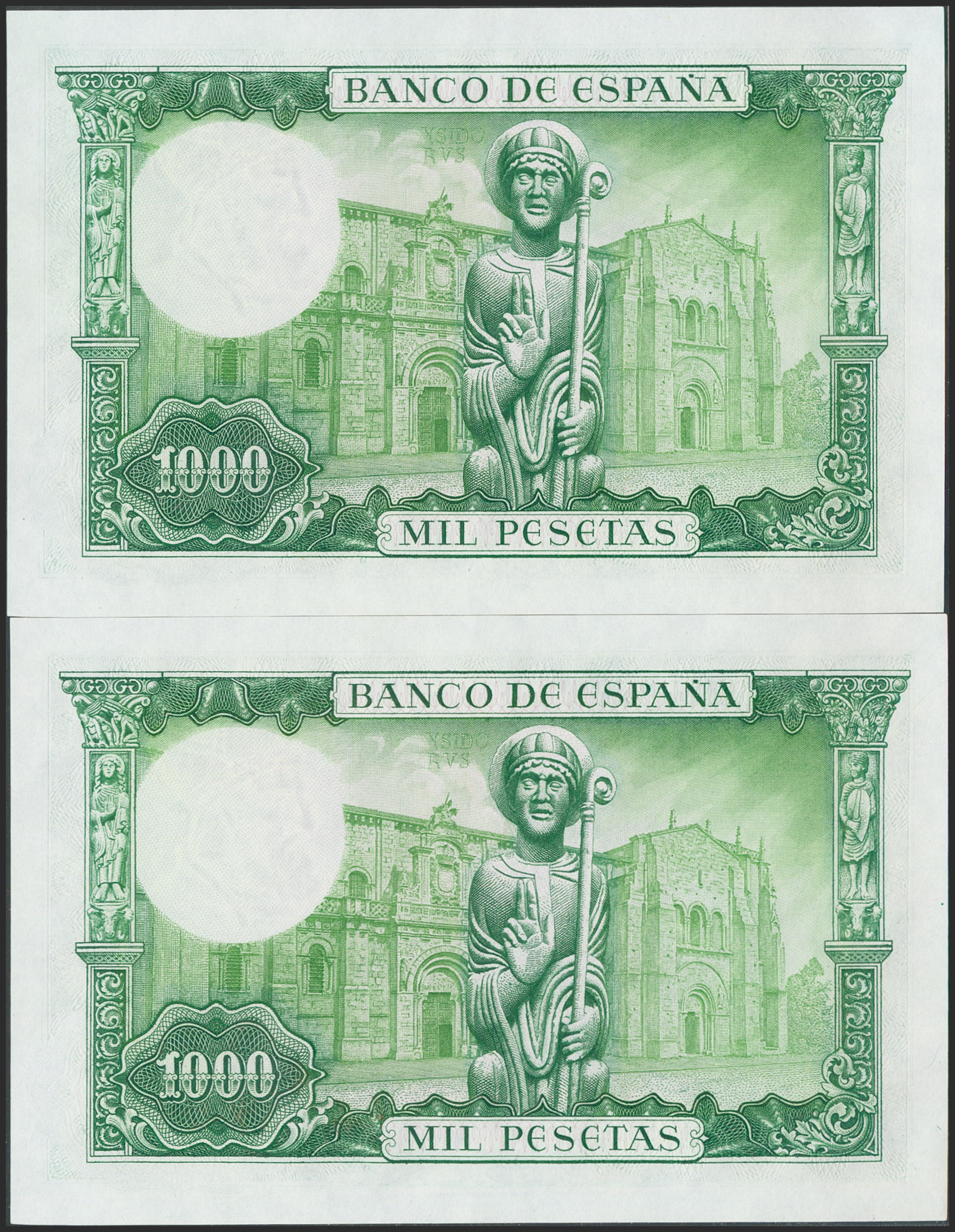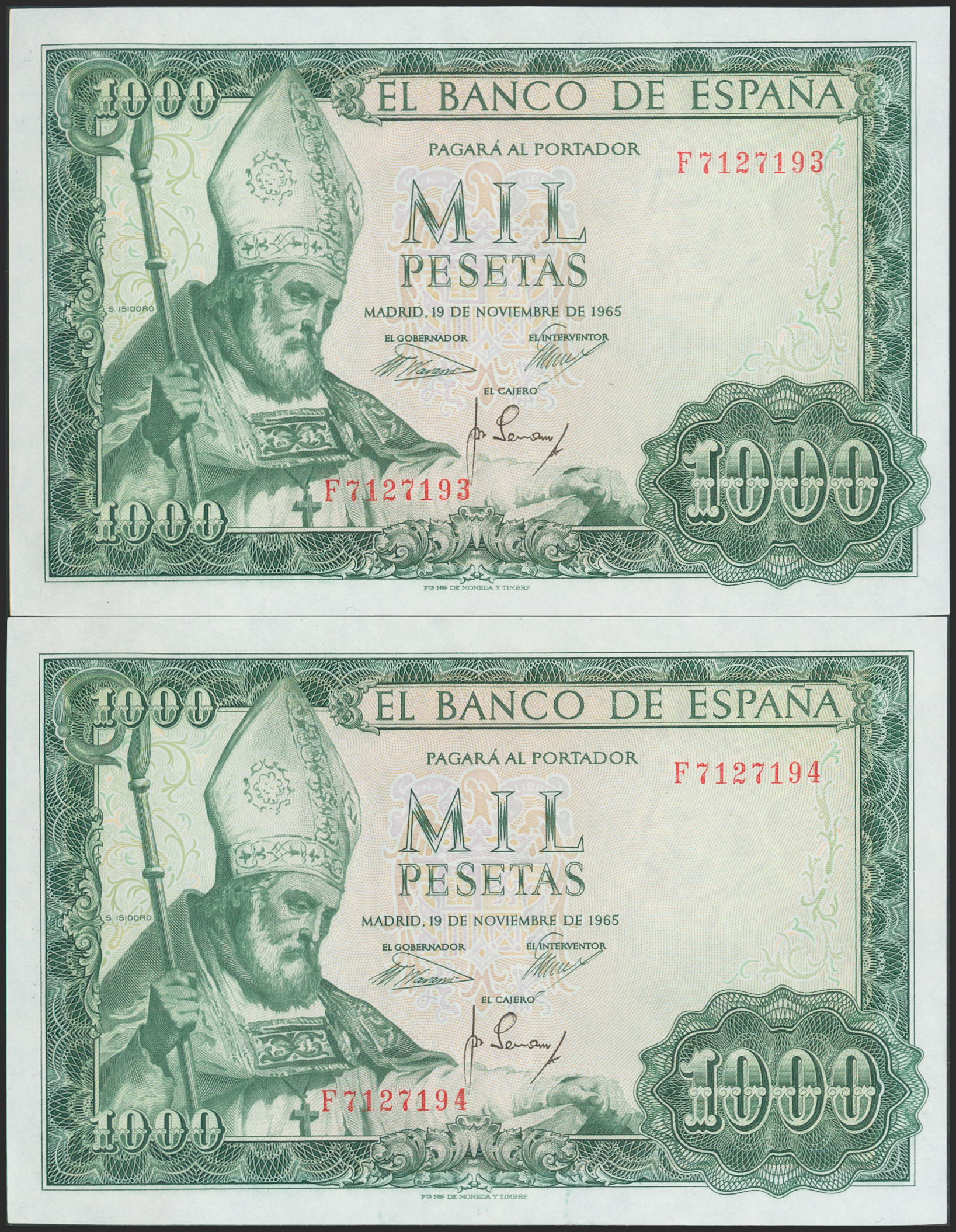 1000 Pesetas. 19 de Noviembre de 1965. Pareja correlativa. Serie F. (Edifil 2017: 471b). Conserva todo su apresto original. SC-.