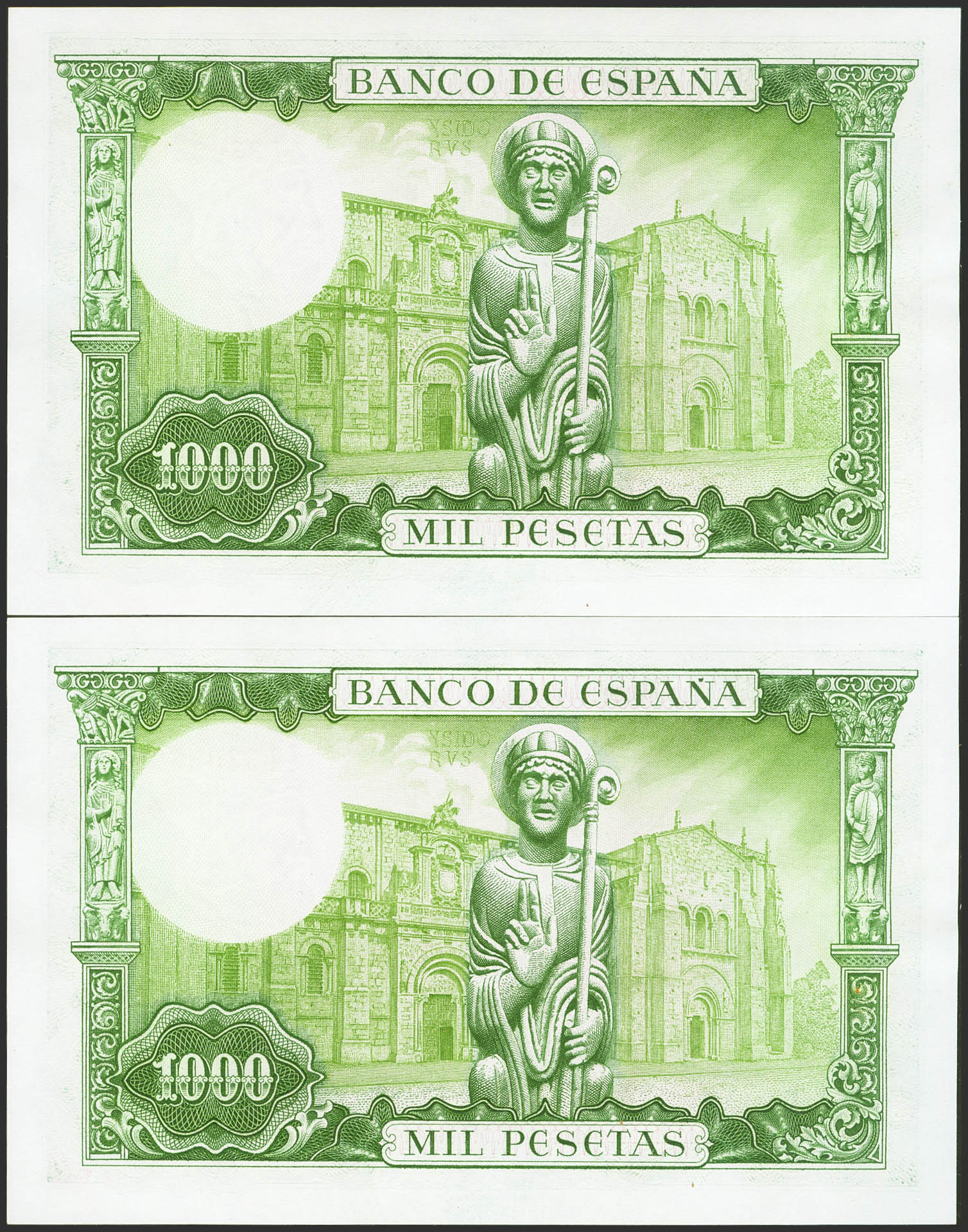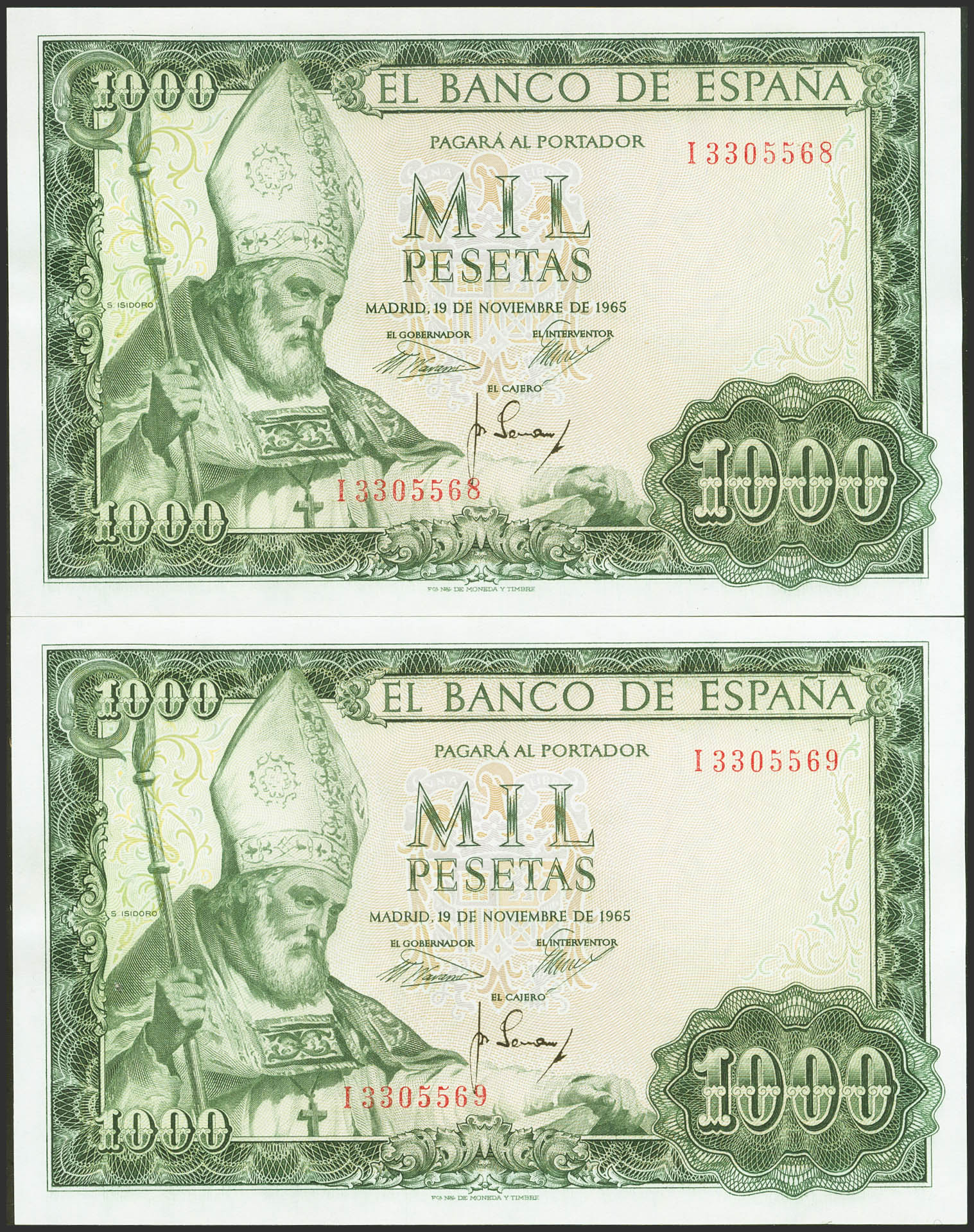 1000 Pesetas. 19 de Noviembre de 1965. Pareja correlativa. Serie I. (Edifil 2017: 471b). Conserva todo su apresto original. SC.