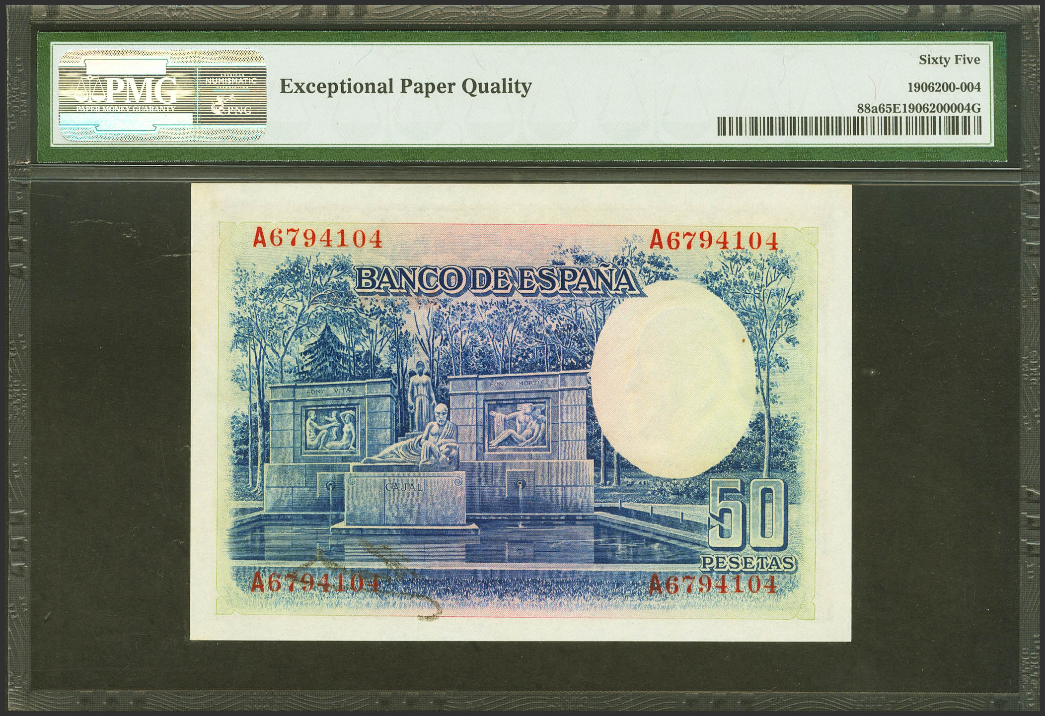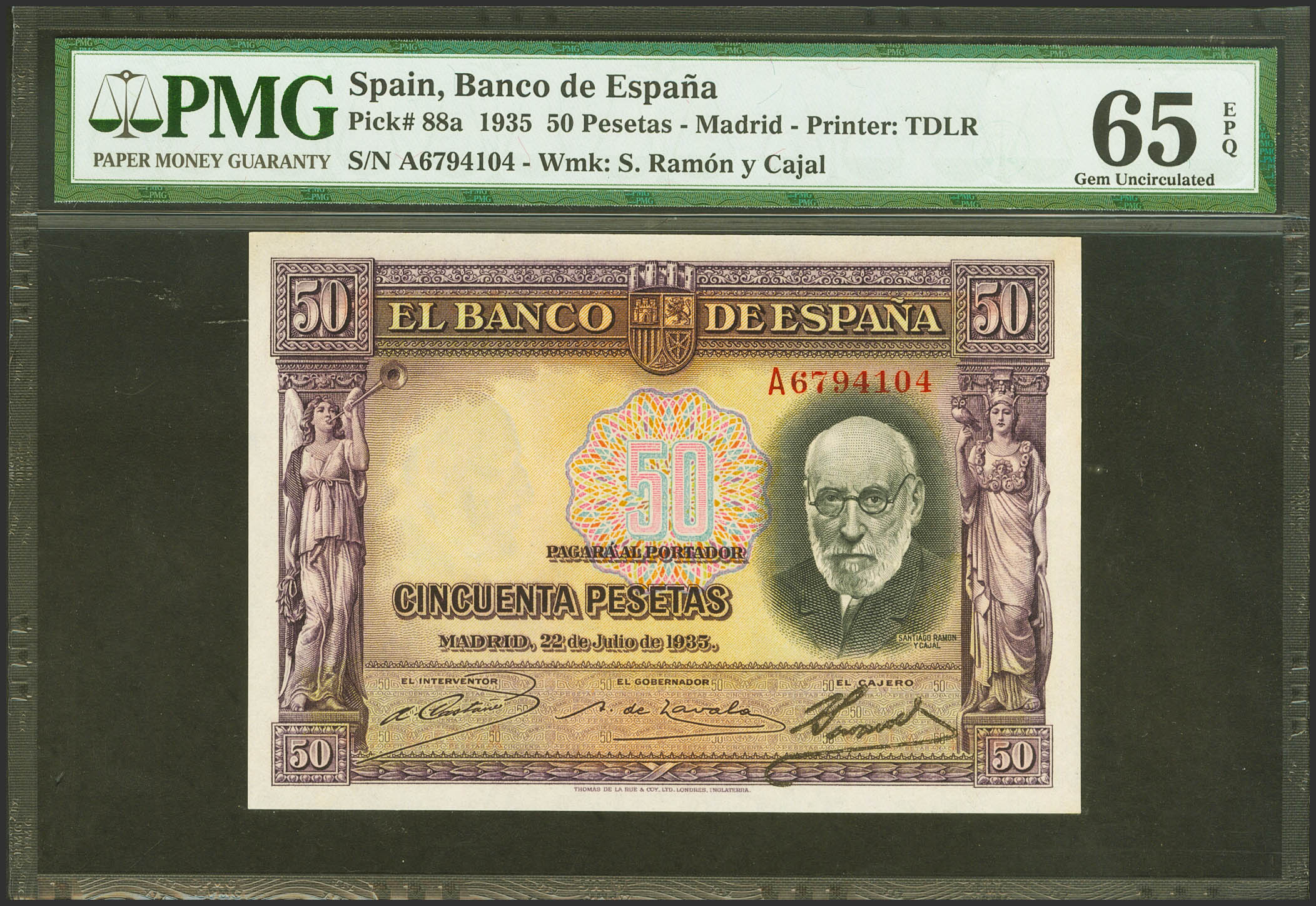 50 Pesetas. 22 de Julio de 1935. Serie A. (Edifil 2021: 366a). Apresto original. SC. Encapsulado PMG65EPQ.