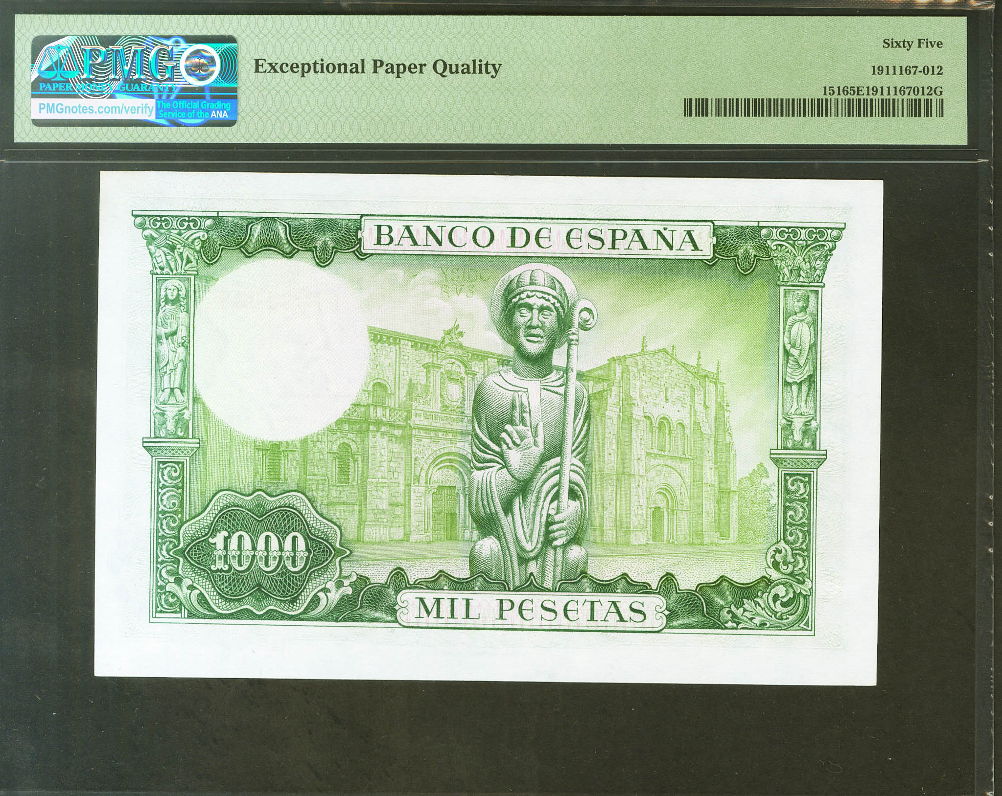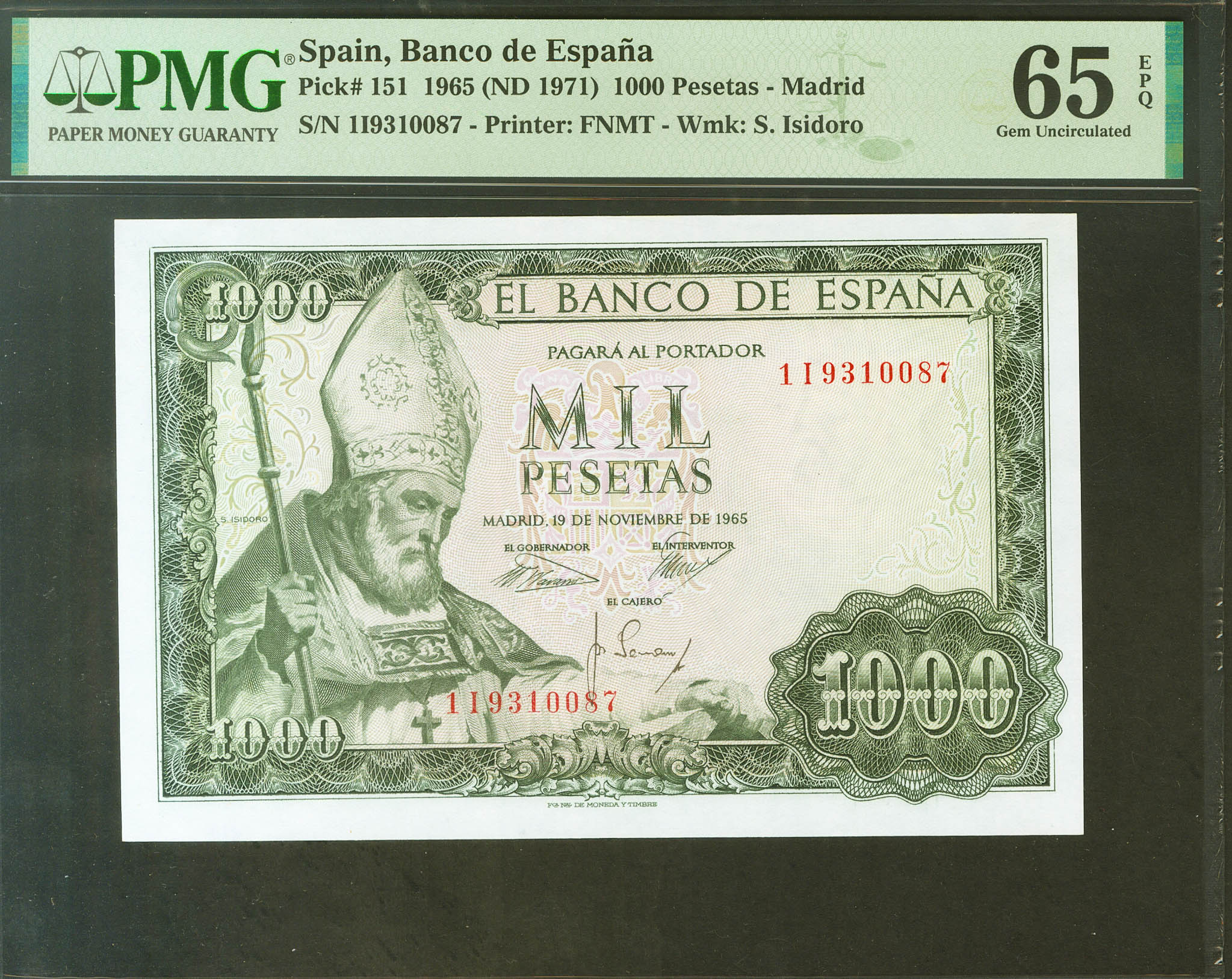 1000 Pesetas. 19 de Noviembre de 1965. Serie 1I. (Edifil 2021: 471b, Pick: 151). Apresto original. SC. Encapsulado PMG65EPQ.