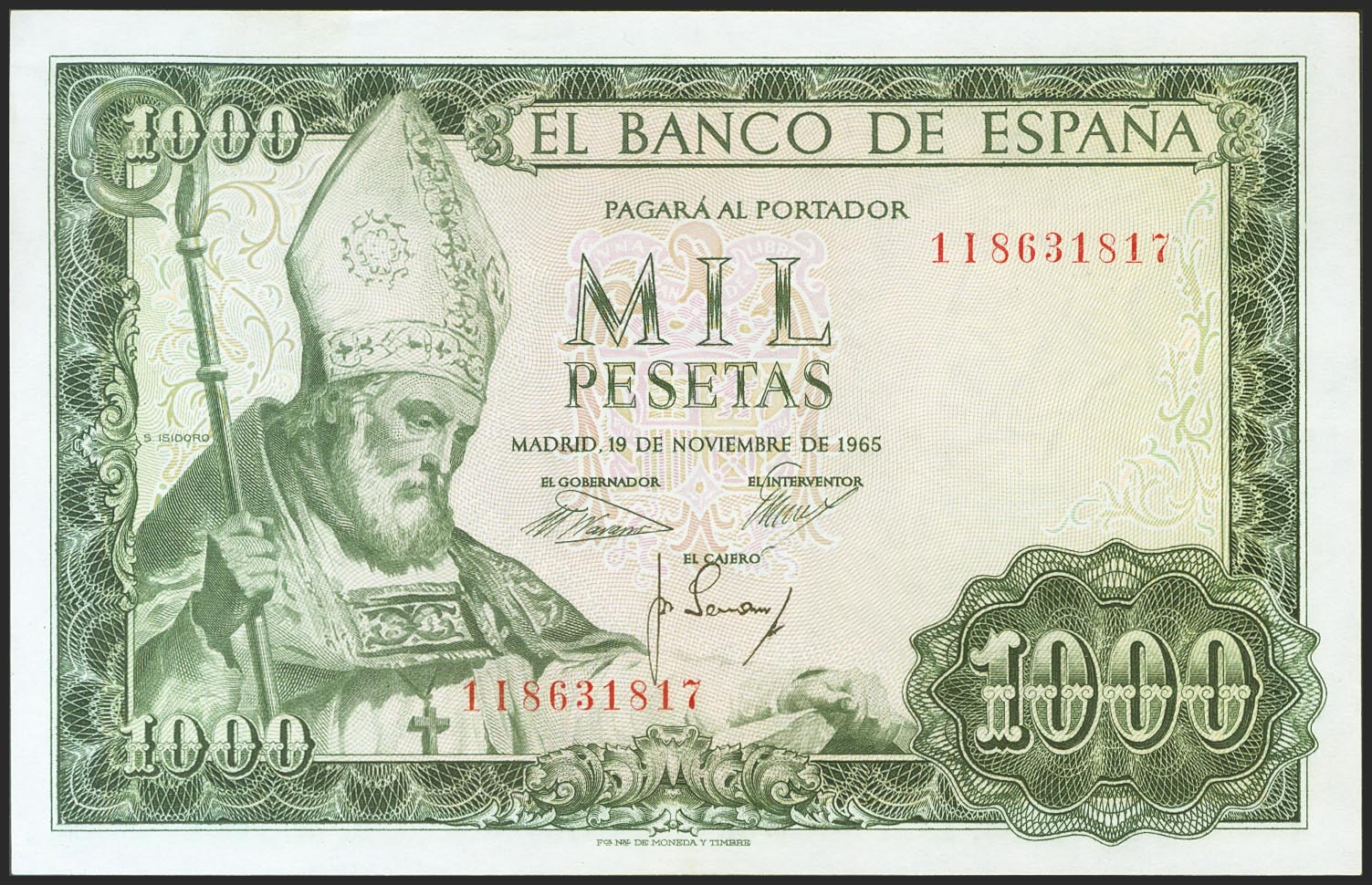 1000 Pesetas. 19 de Noviembre de 1965. Serie 1I. (Edifil 2021: 471b). Apresto original. SC-.