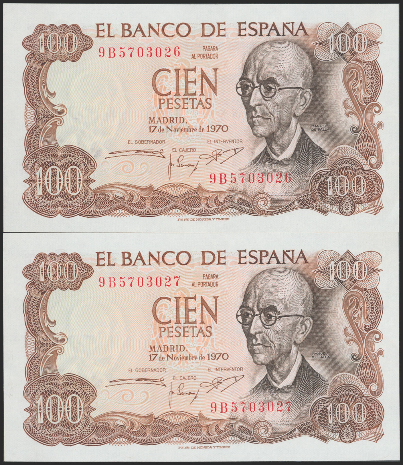 100 Pesetas. 17 de Noviembre de 1970. Pareja correlativa. Serie 9B, serie especial. (Edifil 2017: 472d). SC/SC-.