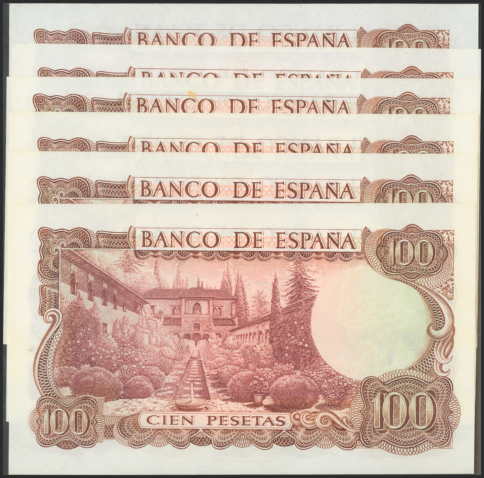 Conjunto de 6 billetes en tramos casi correlativos de 100 Pesetas, emitidos el 17 de Noviembre de 1970, con la serie 7C (Edifil 2017: 472c), con su apresto original. SC/SC-.