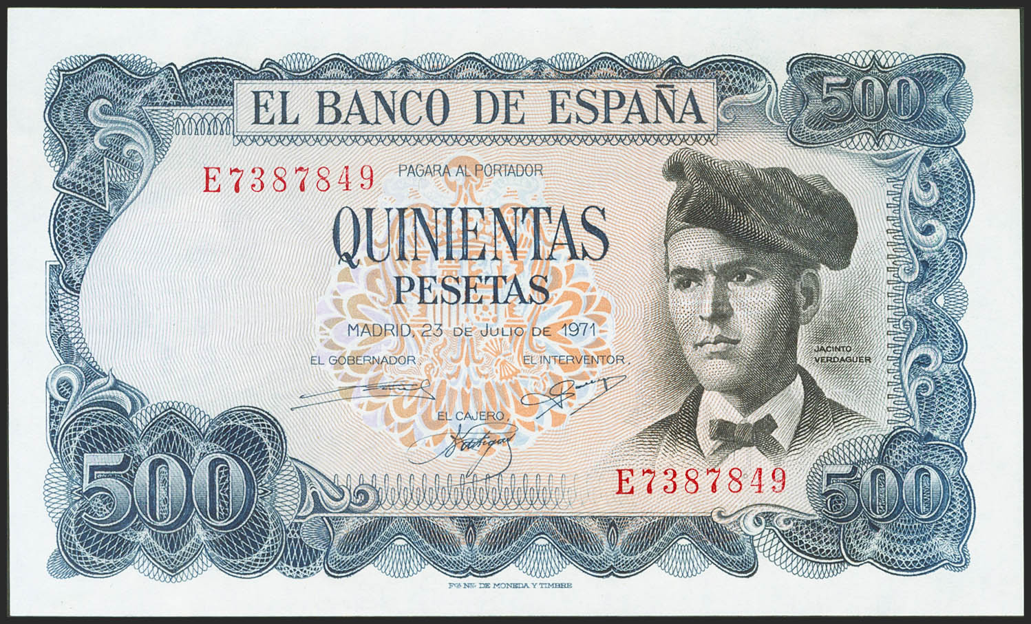 500 Pesetas. 23 de Julio de 1971. Serie E. (Edifil 2021: 473a). Apresto original. SC.