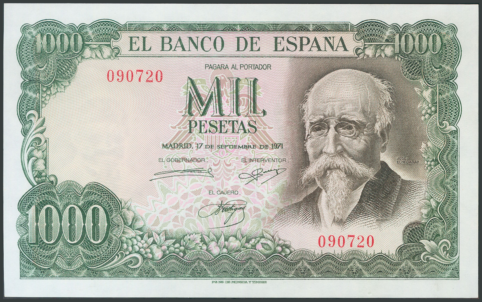 1000 Pesetas. 17 de Septiembre de 1971. Sin serie y numeración baja. (Edifil 2017: 474). Apresto original. SC.
