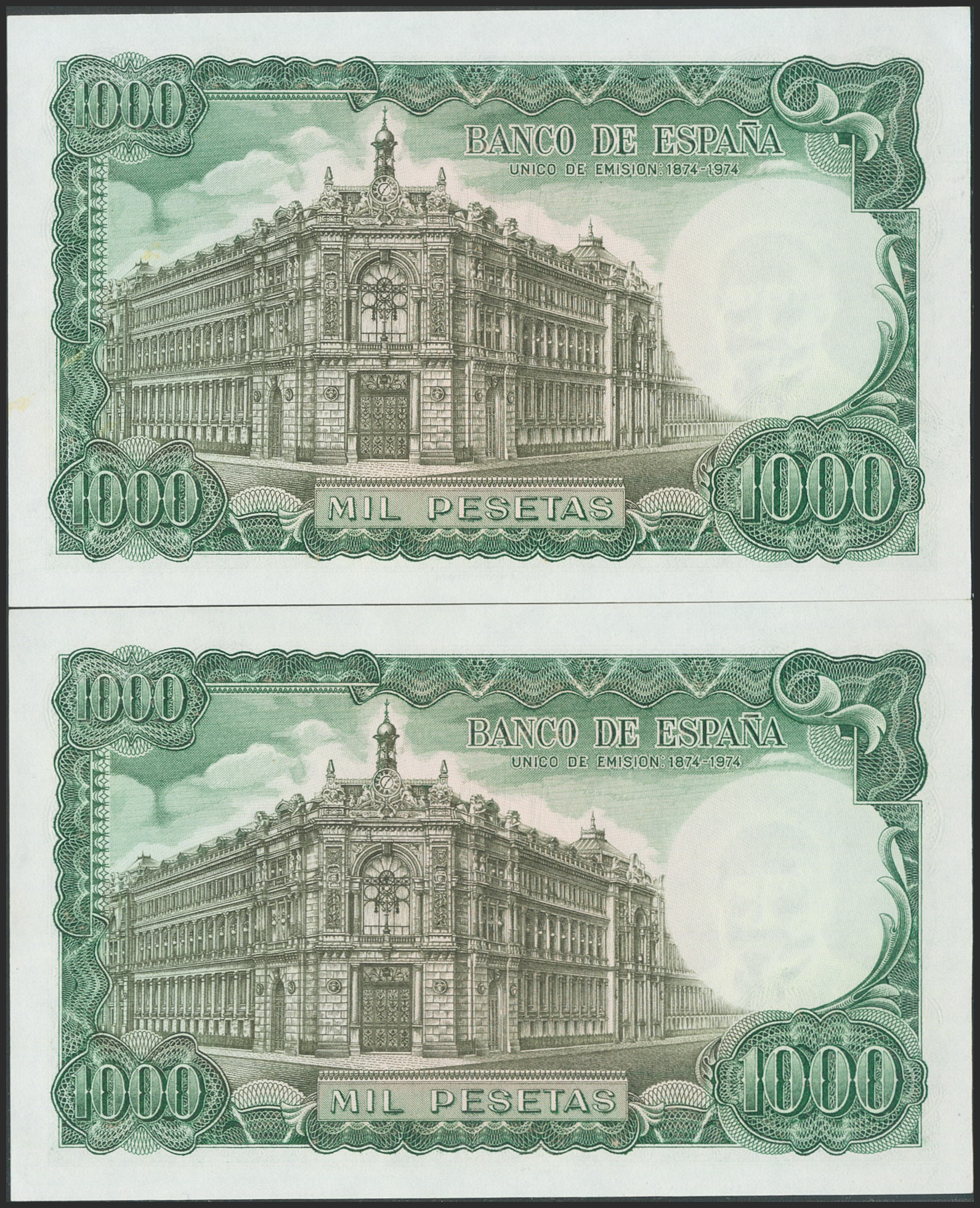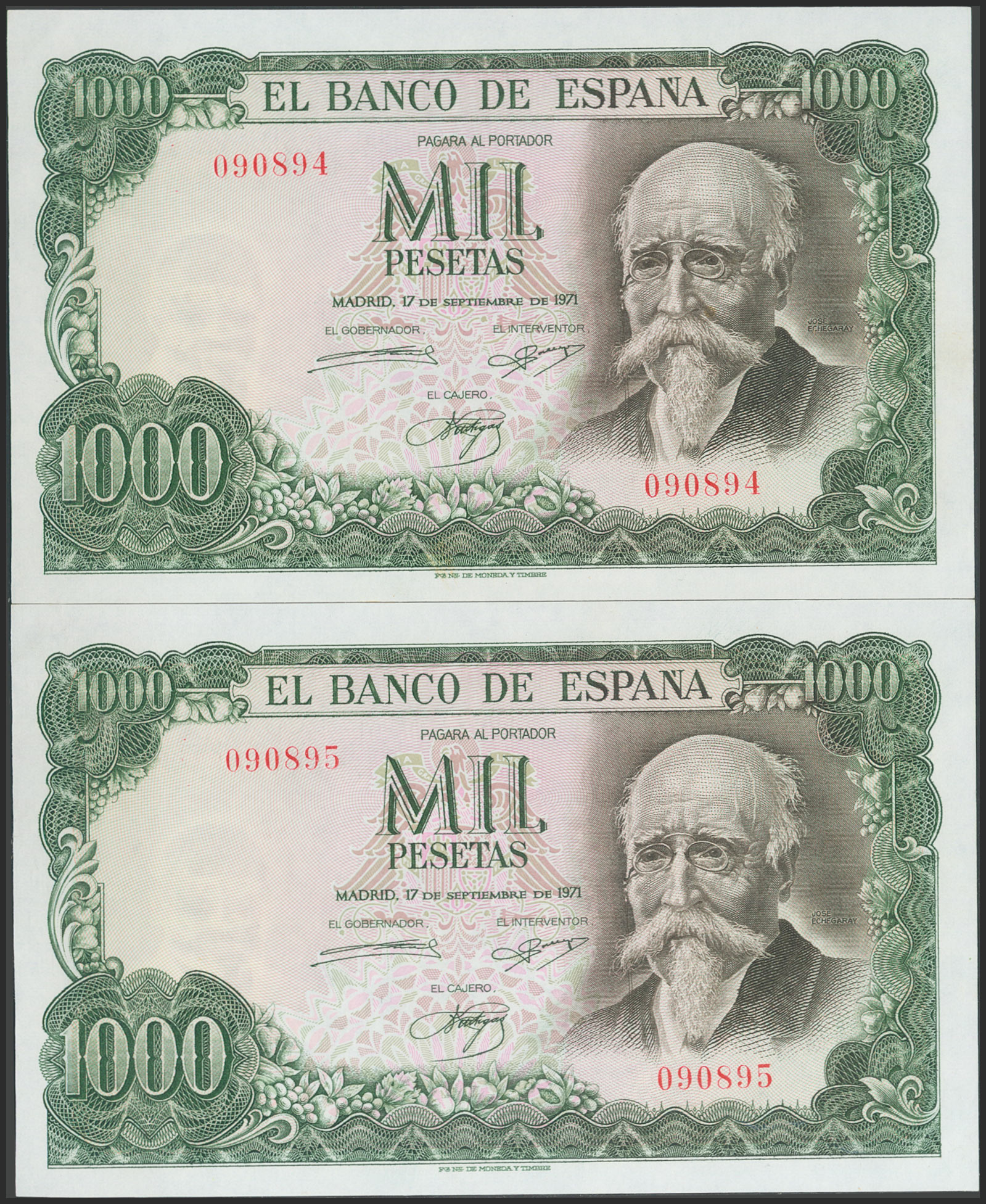 1000 Pesetas. 17 de Septiembre de 1971. Pareja correlativa. Sin serie. (Edifil 2017: 474). Conserva todo su apresto original. SC-.