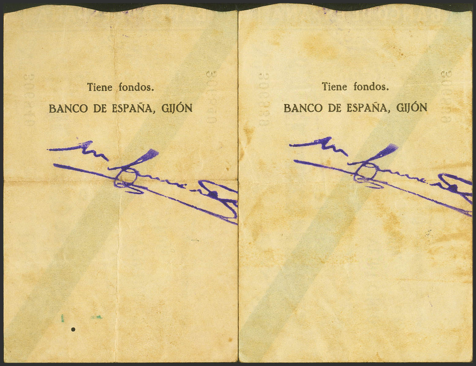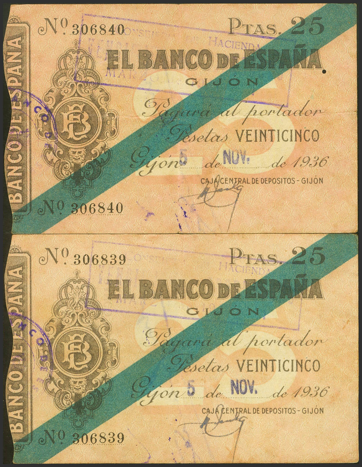 25 Pesetas. 5 de Noviembre de 1936. Sucursal de Gijón. Pareja correlativa. Sin serie. (Edifil 2021: 382). Rarísima pareja, especialmente en esta calidad para este billete, que siempre está en calidades bajas. EBC-.