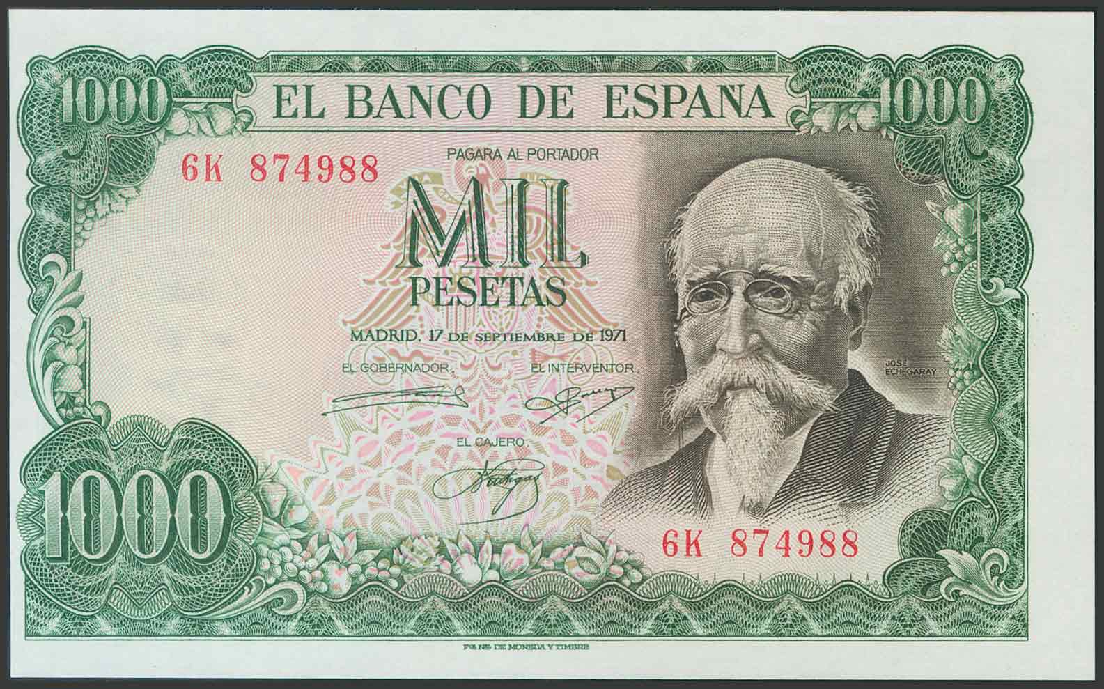 1000 Pesetas. 17 de Septiembre de 1971. Error de guillotinado "descentrado". Serie 6K. (Edifil 2017: 474c). Apresto original. Inusual y muy espectacular. SC.