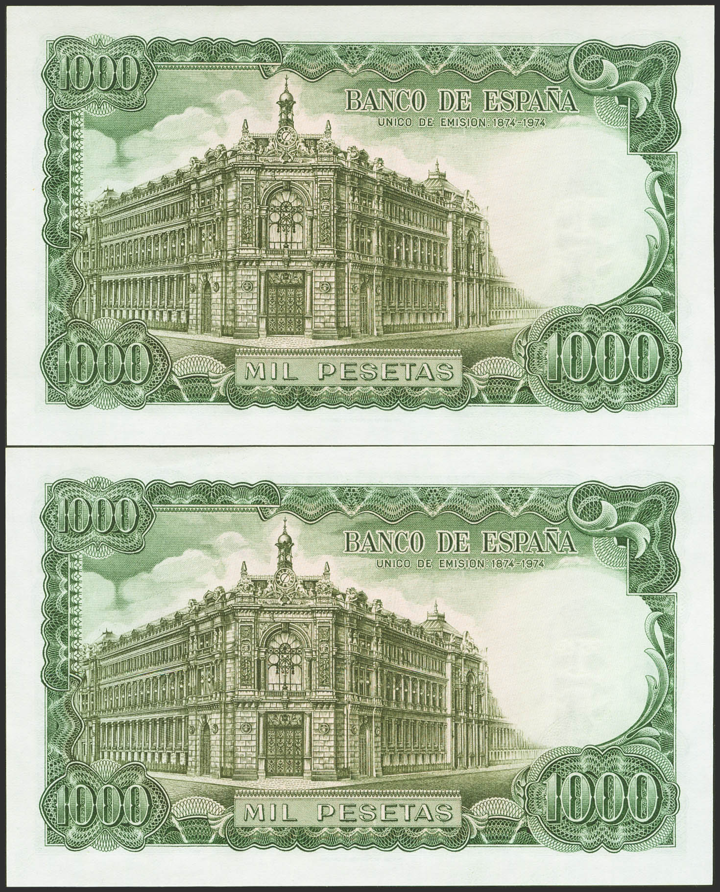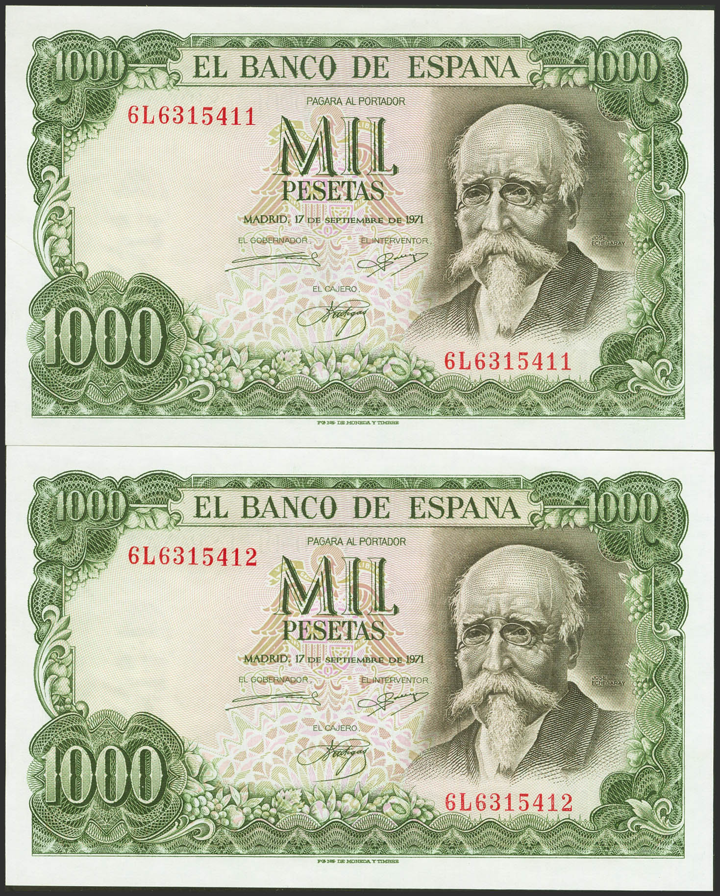 1000 Pesetas. 17 de Septiembre de 1971. Pareja correlativa. Serie 6L. (Edifil 2021: 474c). Apresto original. SC.