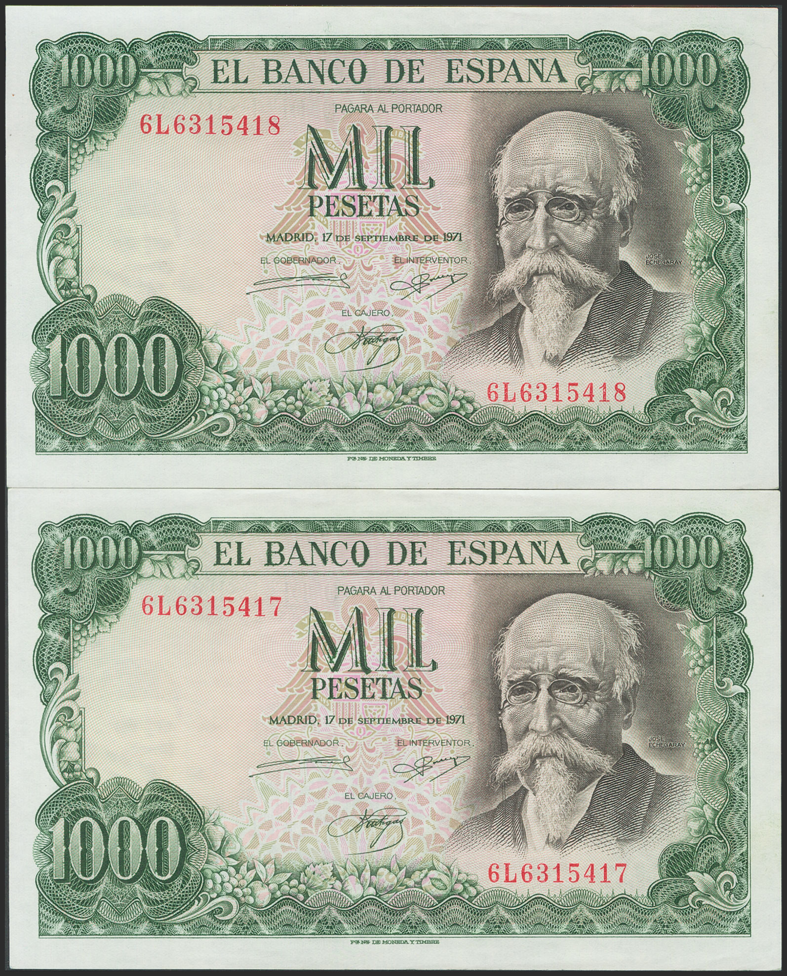 1000 Pesetas. 17 de Septiembre de 1971. Pareja correlativa. Serie 6L. (Edifil 2021: 474c). Apresto original. EBC+.