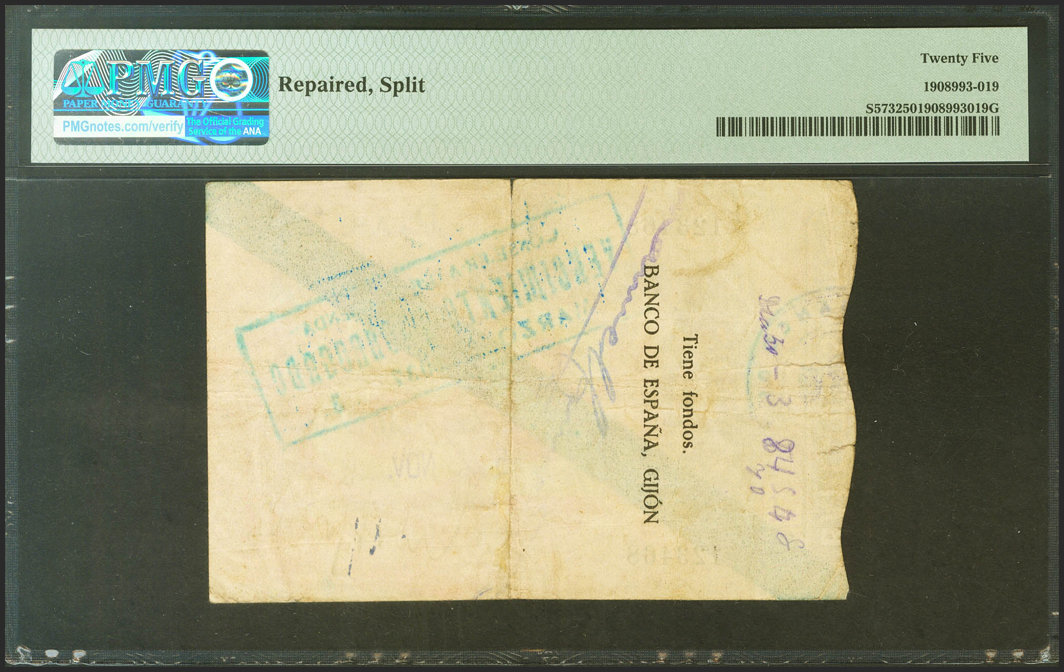 25 Pesetas. 5 de Noviembre de 1936. Sucursal de Gijón. Sin serie. (Edifil 2021: 382, Pick: S573). Raro. MBC+. Encapsulado PMG25.
