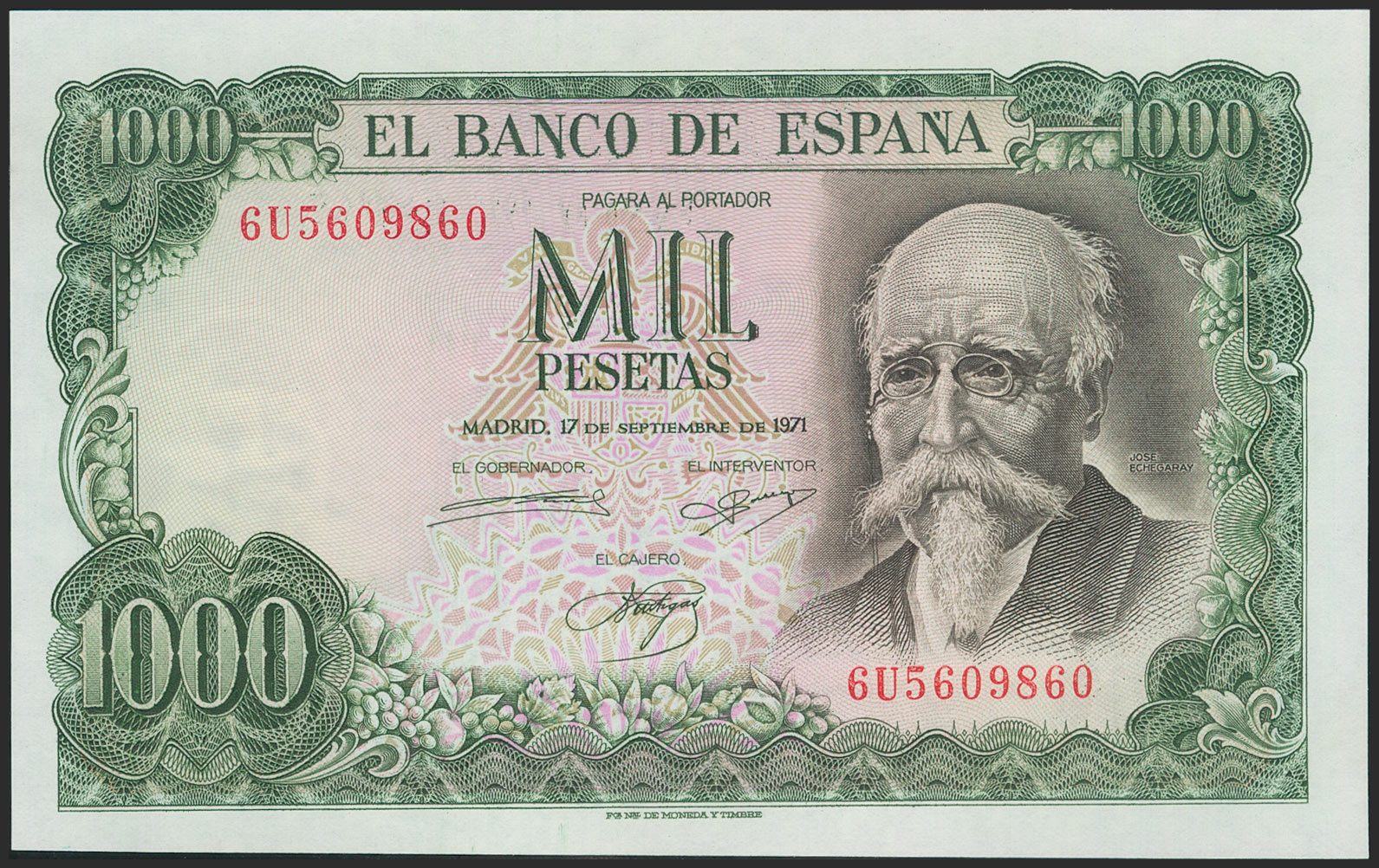 1000 Pesetas. 17 de Septiembre de 1971. Serie 6U. (Edifil 2021: 474c). Apresto original. SC.