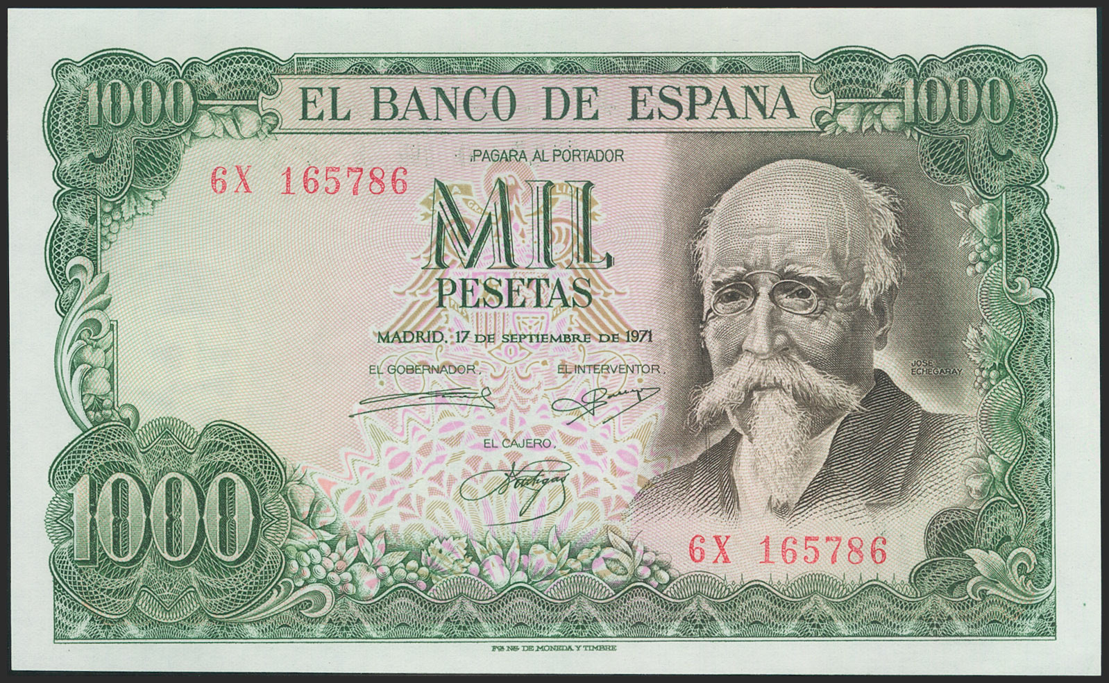 1000 Pesetas. 17 de Septiembre de 1971. Serie 6X. (Edifil 2021: 474c). Apresto original. SC.