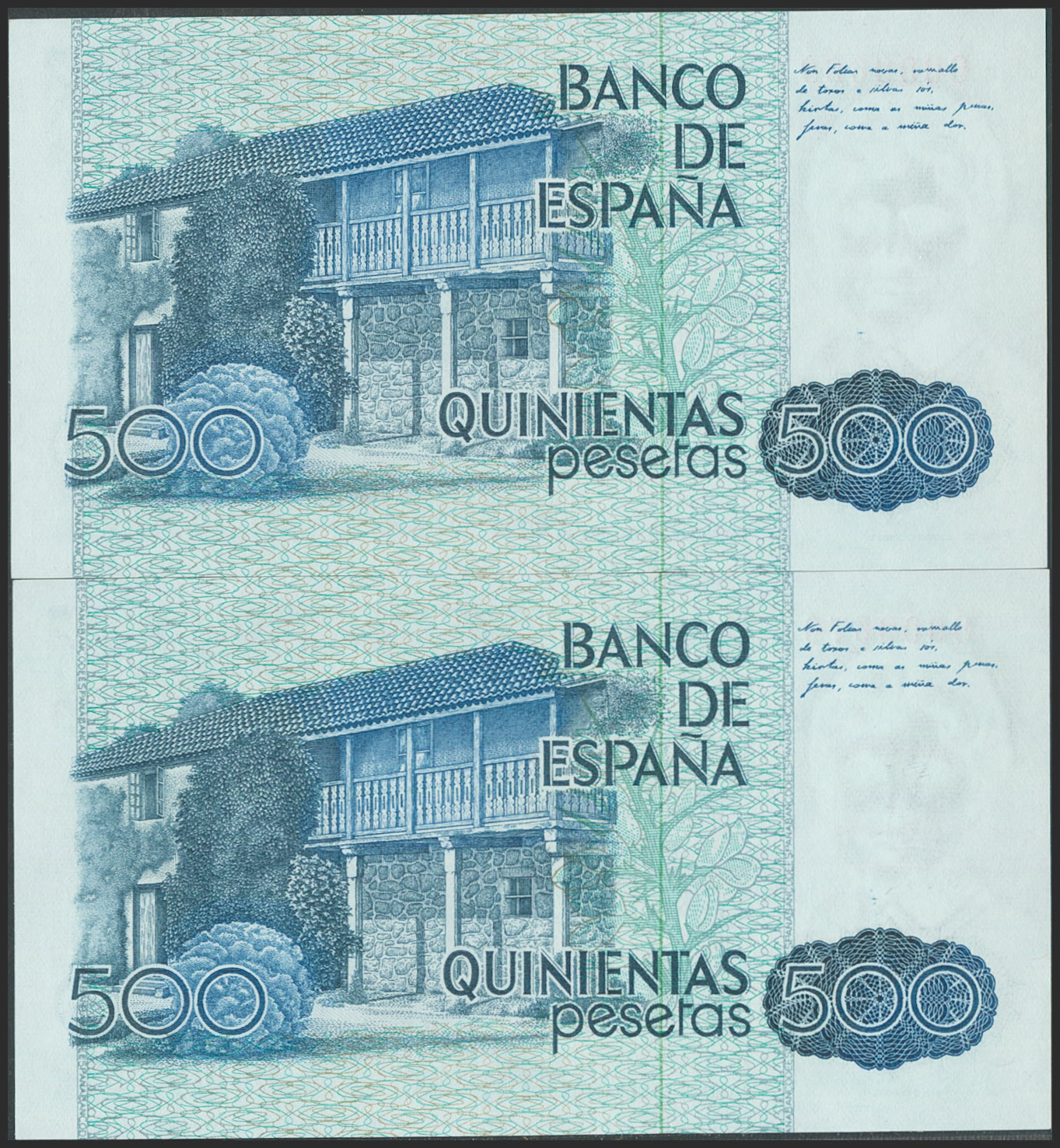 500 Pesetas. 23 de Octubre de 1979. Pareja correlativa. Sin serie, numeración baja y uno de ellos capicúa imperfecto. (Edifil 2017: 476). SC.