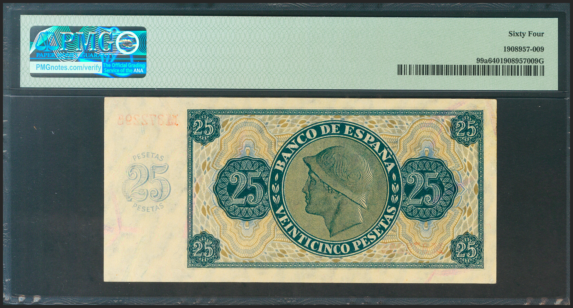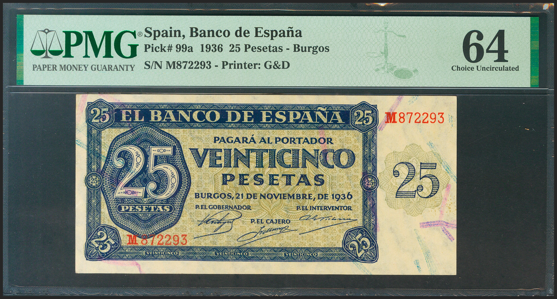 25 Pesetas. 21 de Noviembre de 1936. Serie M. (Edifil 2021: 419a, Pick: 99a). Inusual en esta calidad. SC. Encapsulado PMG64.