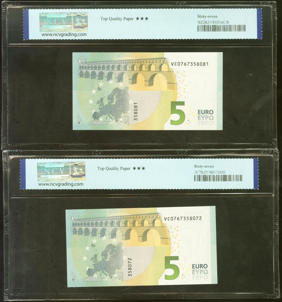 5 Euros. 2 de Mayo de 2013. Pareja correlativa. Firma Lagarde. Serie V (España) (cabe recordar que el último dígito de la numeración de todos los billetes denominados en euros es para control interno del Banco Central Europeo, el que marca la correlatividad de los billetes es el penúltimo dígito). (Edifil 2021: 493A, Pick: 27v). SC. Encapsulado NCV67TPQ.